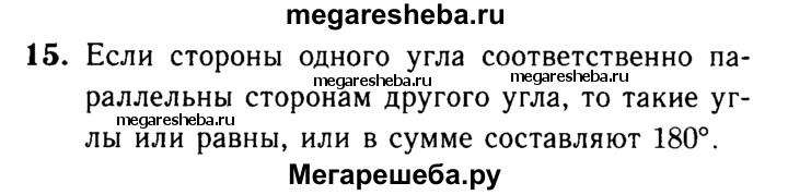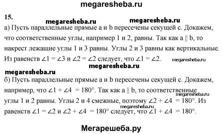 15 Докажите, что при пересечении двух параллельных прямых секущей: а) соответственные углы равны; б) сумма односторонних углов равна 180°.