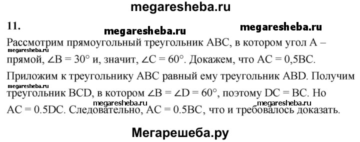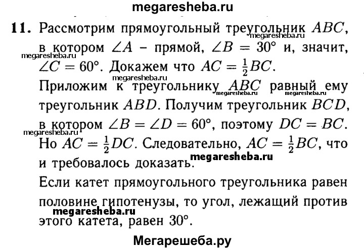 11 Докажите, что катет прямоугольного треугольника, лежащий против угла в 30°, равен половине гипотенузы. Сформулируйте и докажите обратное утверждение.
