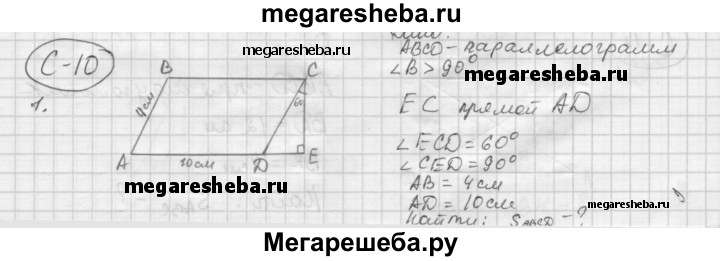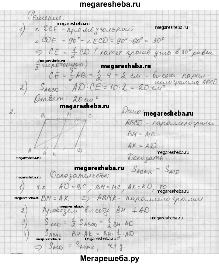 С—10 1. В параллелограмме ABCD угол В тупой. На продолжении стороны AD за вершину D отмечена точка Е так, что ∠ECD = 60°, ∠CED = 90°, АВ = 4 см, AD = 10 см. Найдите площадь параллелограмма. 2. В параллелограмме ABCD точки М и К — середины сторон ВС и AD соответственно. Докажите, что площадь четырехугольника АВМК равна площади треугольника ACD.