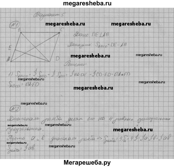 С – 9 1. На стороне АВ параллелограмма ABCD отмечена точка Е так, что DE ⊥ АВ. Докажите, что площадь параллелограмма ABCD равна DE * АВ. 2. Докажите, что площадь ромба равна половине произведения его диагоналей.