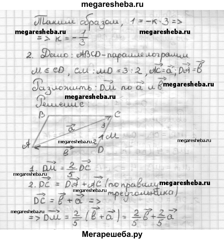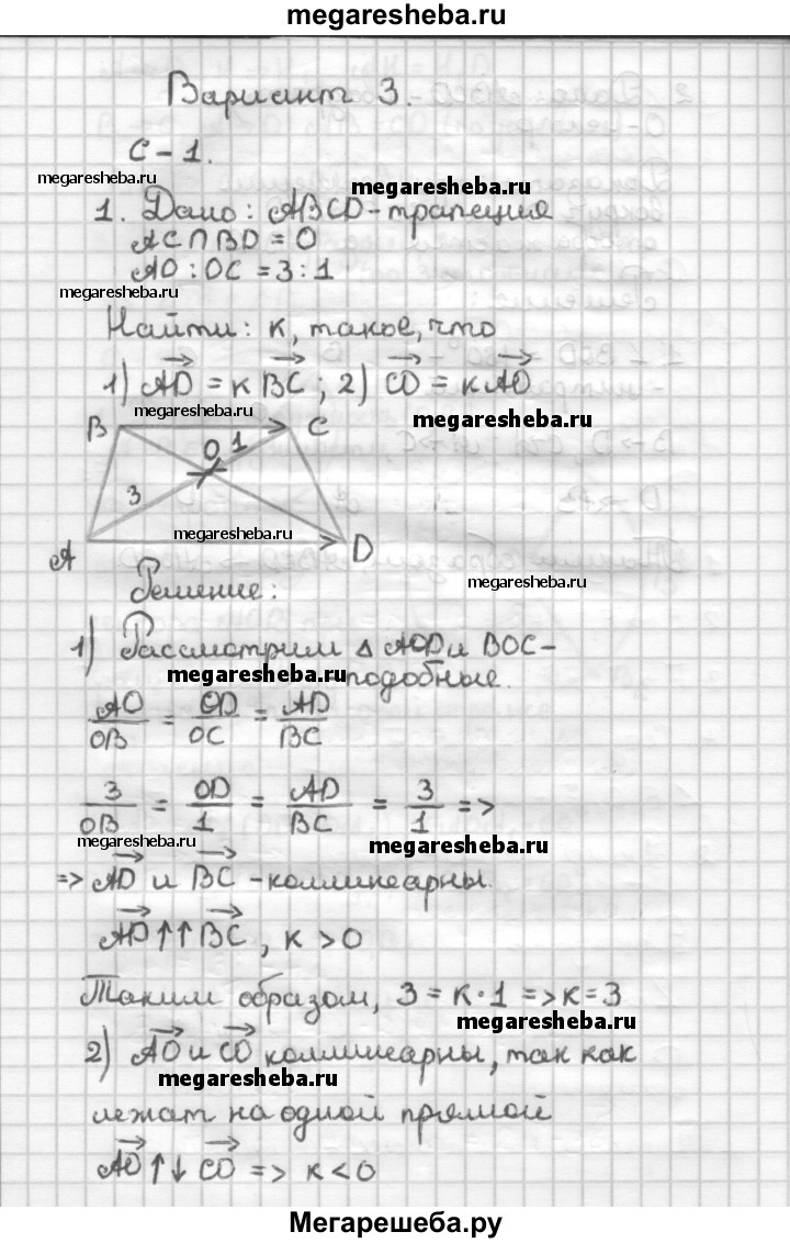 С—1 1. В трапеции ABCD AD и ВС — основания, АС и BD пересекаются в точке О, причем АО : ОС = 3:1. Найдите, если возможно, такое число k, что: 1) AD = kBC; 2) CO=kAO. 2. В параллелограмме ABCD М е CD, причем СМ : MD = 3:2. Разложите вектор DM по векторам АС = а и DA = b.