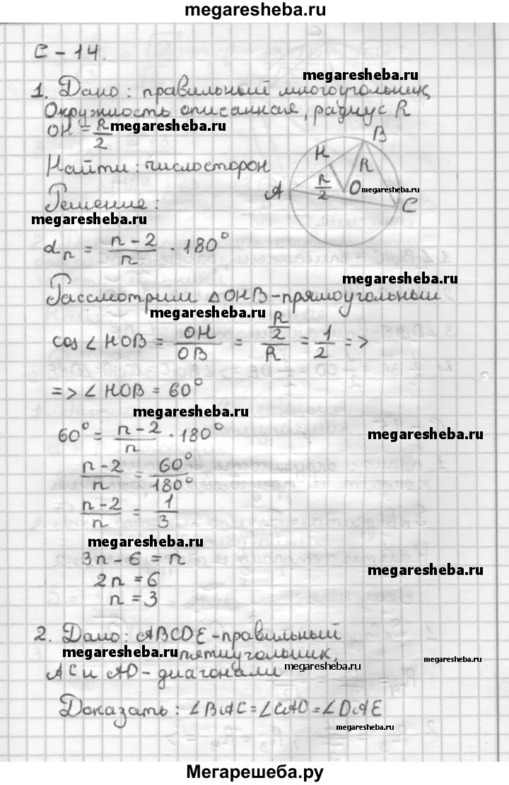 С—14 1. Вокруг правильного многоугольника описана окружность, радиус которой равен R. Стороны многоугольника удалены от его центра на расстояние, равное у. Чему равно число сторон этого многоугольника? 2. Докажите, что в правильном пятиугольнике ABCDE диагонали АС и AD делят угол ВАЕ на три равные части.