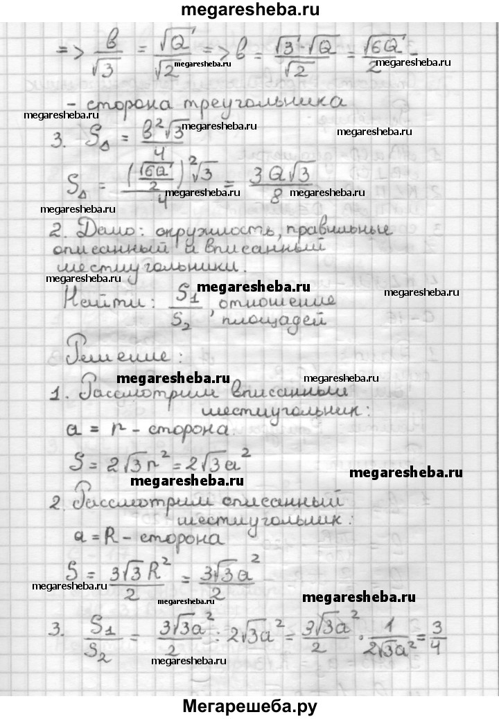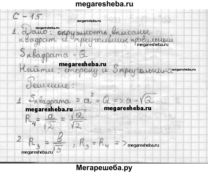 С—15 1. В окружность вписаны квадрат и правильный треугольник. Площадь квадрата равна Q. Найдите сторону и площадь треугольника. 2. В окружность вписан правильный шестиугольник, и вокруг окружности описан правильный шестиугольник. Найдите отношение их площадей. 3. С помощью циркуля и линейки опишите около окружности правильный четырехугольник.