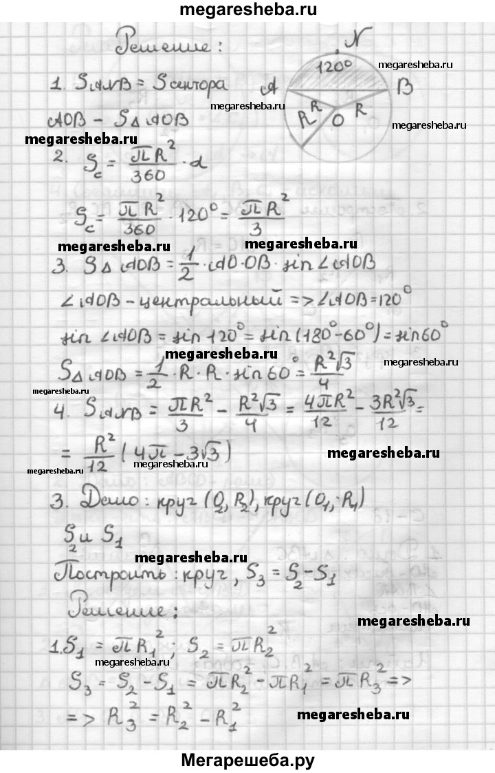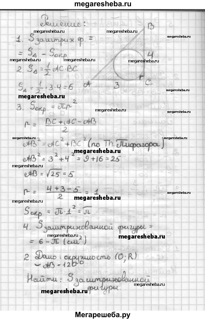 С-17 1. Катеты прямоугольного треугольника равны 3 см и 4 см. Найдите площадь заштрихованной фигуры, изображенной на рисунке 15. Рис. 15 2. Дуга АВ содержит 120°, а радиус равен R. Найдите площадь заштрихованной фигуры, изображенной на рисунке 16. 3. Постройте круг, площадь которого равна разности площадей двух данных кругов.