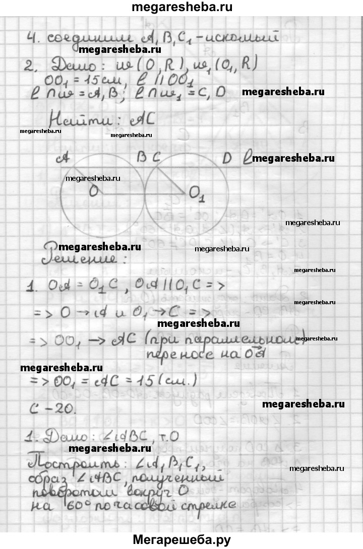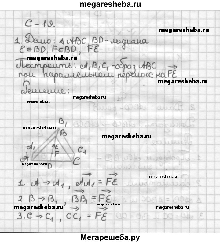 С—19 1. В произвольном треугольнике ABC BD — медиана. Точки Е и F принадлежат медиане BD (В—F—Е). Постройте образ треугольника ABC при параллельном переносе на вектор FE. 2. Даны две равные окружности с центрами в точках О и Ох, ОО1 = 15 см. Прямая I, параллельная прямой ОО1, пересекает эти окружности в точках А, В, С и D (А—В—С—D). Найдите длину отрезка АС.