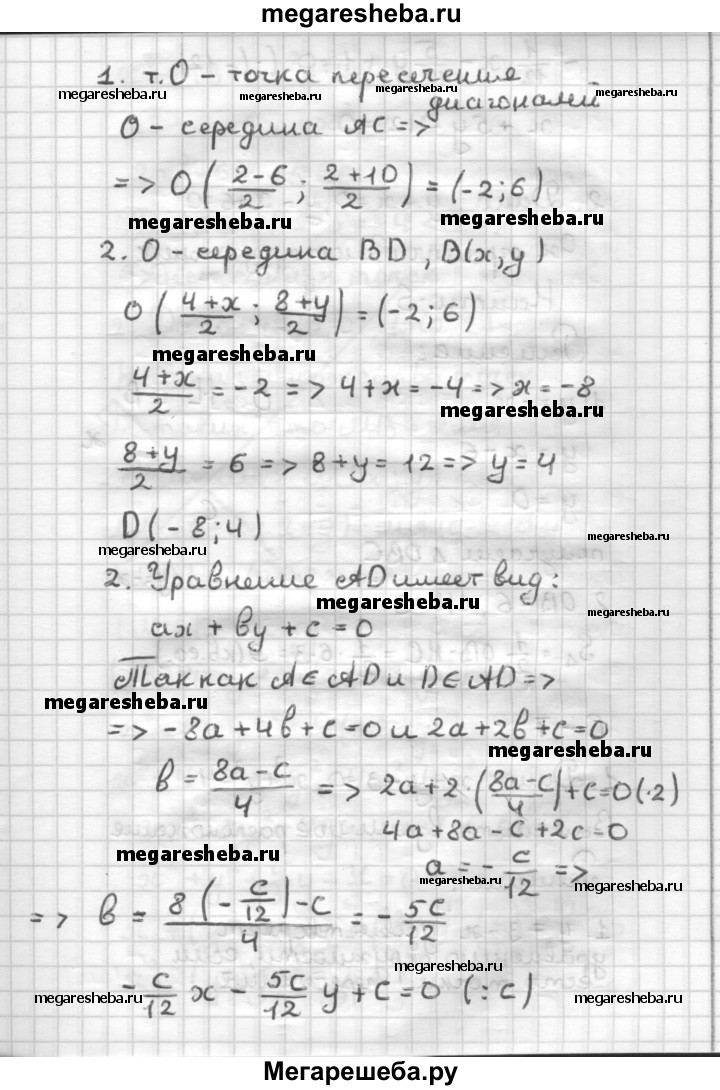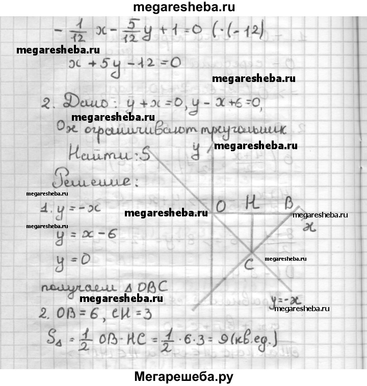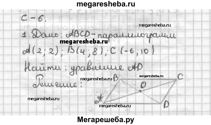 С—6 1. Даны три последовательные вершины параллелограмма ABCD: А (2; 2), В (4; 8) и С (-6; 10). Напишите уравнение прямой AD. 2. Найдите площадь треугольника, ограниченную прямыми у + х = 0, у - х + 6 = 0 и осью Ох.