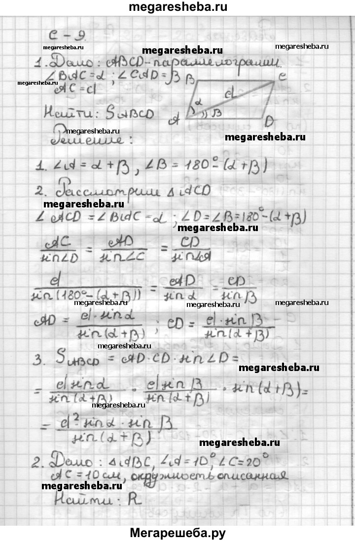 С—9 1. В параллелограмме ABCD диагональ АС разбивает угол А на два угла а и (3; АС = d. Найдите площадь параллелограмма. 2. В треугольнике ABC ∠A = 10°, ∠C = 20°, ∠С = 10 см. Найдите радиус окружности, описанной около этого треугольника.