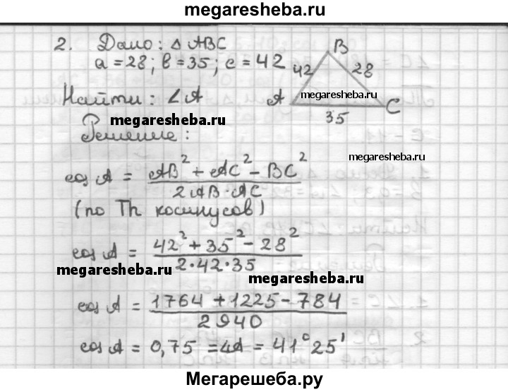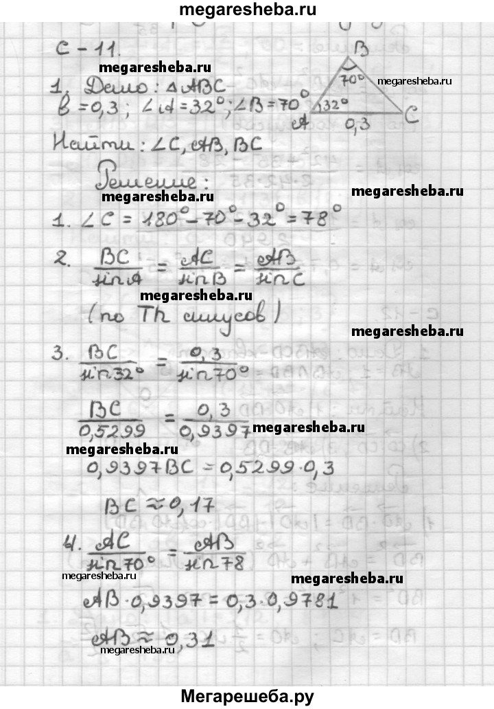 С—11 1. В треугольнике ABC b = 0,3, ∠А = 32°, ∠B = 70°. Найдите неизвестные элементы треугольника. 2. В треугольнике ABC а = 28, b = 35, с = 42. Найдите угол, лежащий против меньшей стороны.