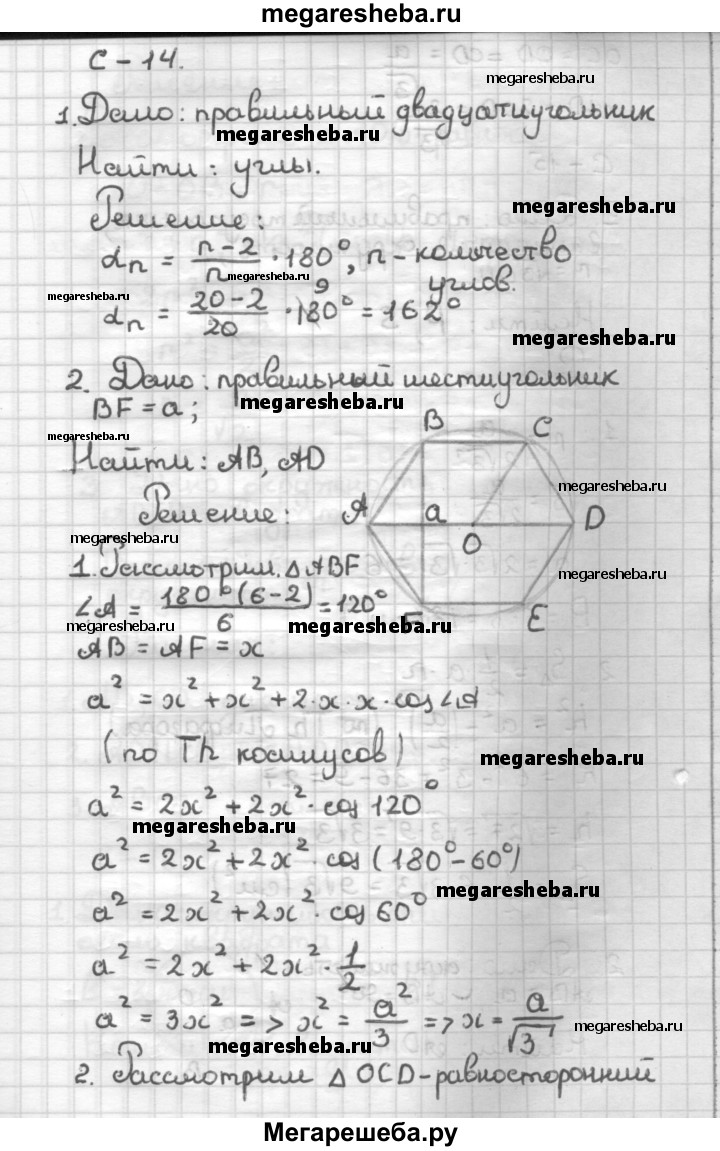 С—14 1. Найдите углы правильного двадцатиугольника. 2. Меньшая диагональ правильного шестиугольника равна а. Найдите сторону шестиугольника и его большую диагональ.