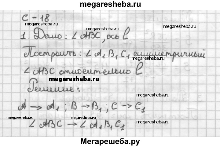 С—18 1. На рисунке 4 изображен угол ABC. Постройте угол, симметричный данному относительно оси I. 2. Докажите, что при движении вертикальные углы отображаются на вертикальные углы.