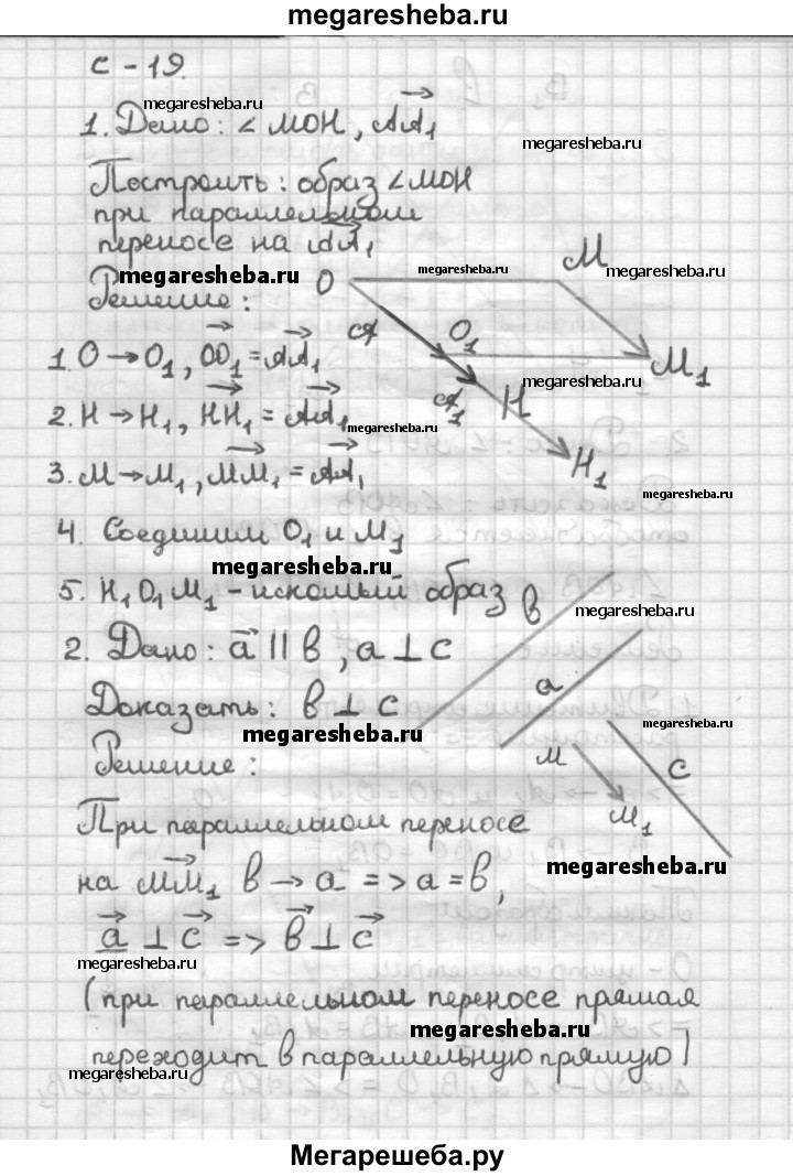 С—19 1. Постройте образ угла МОН (рис. 5) при параллельном переносе на вектор АА1. 2. Используя параллельный перенос, докажите, что если одна из двух параллельных прямых перпендикулярна третьей прямой, то и вторая прямая перпендикулярна этой прямой.