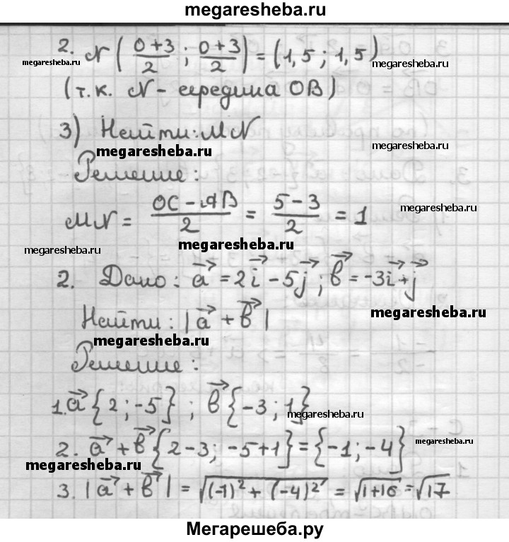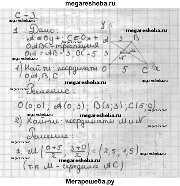 C-3 1. Точка А лежит на положительной полуоси Оу, а точка С — на положительной полуоси Ох. 1) Найдите координаты вершин трапеции ОАВС, если OA = АВ = 3, ОС = 5. 2) Каковы координаты середин диагоналей трапеции? 3) Чему равно расстояние между этими серединами? 2. а = 2i – 5i b =-3i + j. Найдите | а + b |.