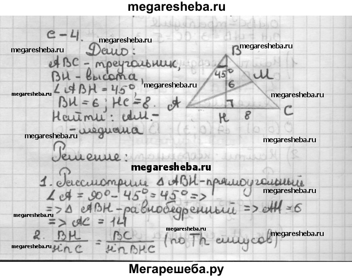 С—4 В треугольнике ABC проведена высота ВН. Найдите длину медианы, проведенной из вершины А, если ∠ABH = 45°, ВН = 6, НС = 8.