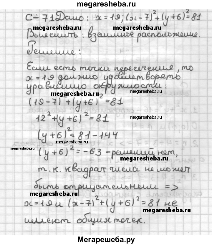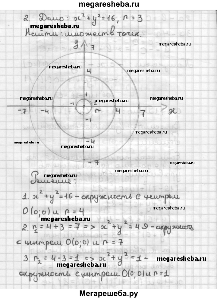 С—7 1. Выясните взаимное расположение прямой х - 19 и окружности (х - 7)2 + (у + б)2 = 81. 2. Найдите множество точек, удаленных от окружности х2 + у2 = 16 на расстояние, равное 3.