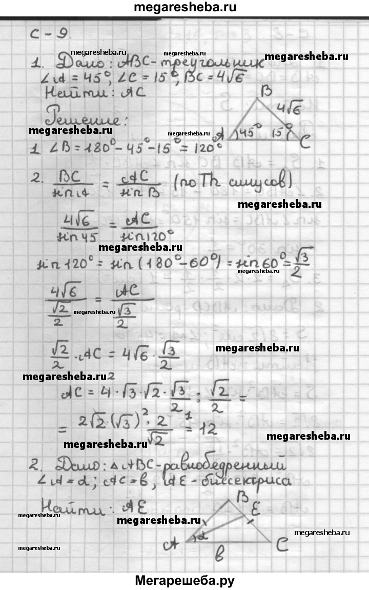 С—9 1. В треугольнике ABC ∠A = 45°, ∠C = 15°, ВС = 4√6. Найдите АС. 2. В равнобедренном треугольнике ABC (АВ - ВС) ∠А = а, АС = b, АЕ — биссектриса. Найдите АЕ.