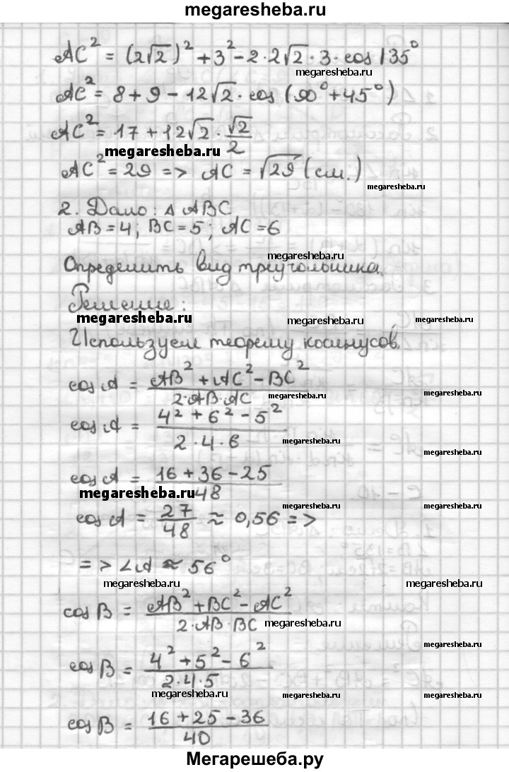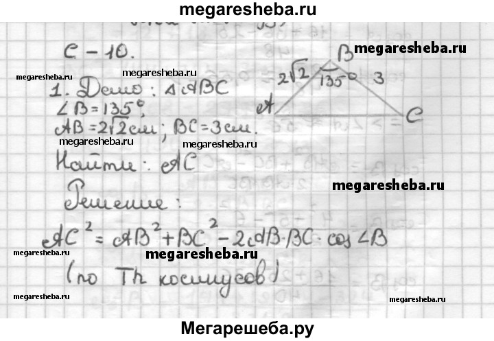 С—10 1. Найдите сторону треугольника, лежащую против угла в 135°, если две другие стороны равны 2√2 см и 3 см. 2. Остроугольным, прямоугольным или тупоугольным является треугольник, стороны которого равны 4, 5, 6?