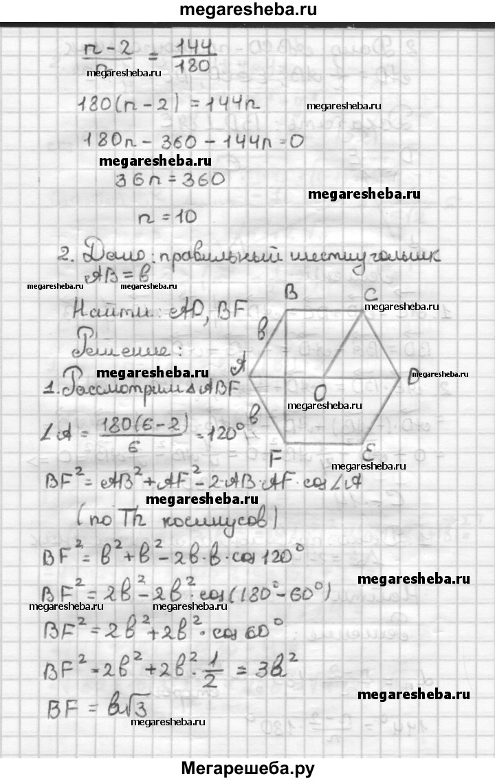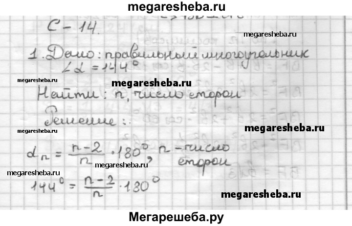 С—14 1. угол правильного многоугольника равен 144°. Найдите число его сторон. 2. Сторона правильного шестиугольника равна b. Найдите его диагонали.