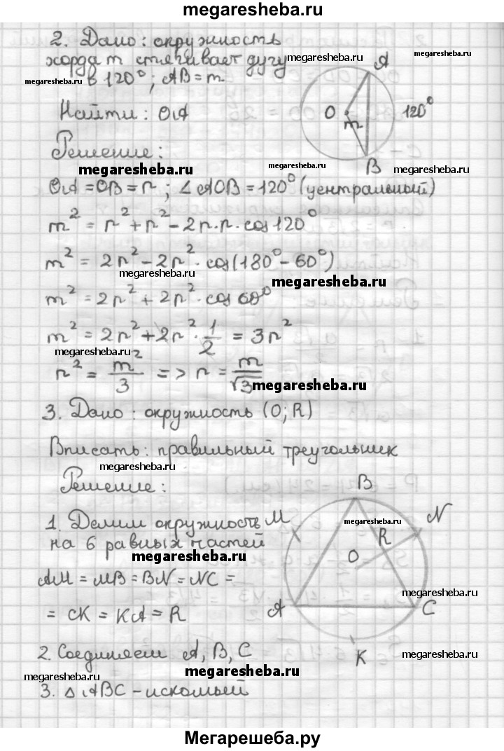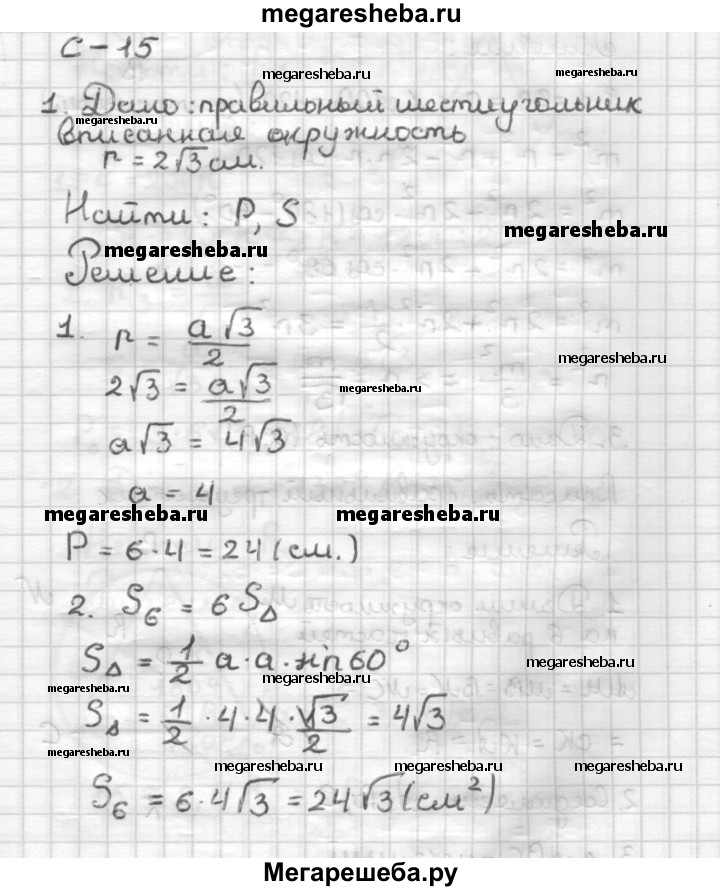 С—15 1. Радиус окружности, вписанной в правильный шестиугольник, равен 2√3 см. Найдите периметр и площадь шестиугольника. 2. Хорда окружности, равная т, стягивает дугу в 120°. Найдите радиус окружности. 3. С помощью циркуля и линейки впишите в данную окружность правильный треугольник.