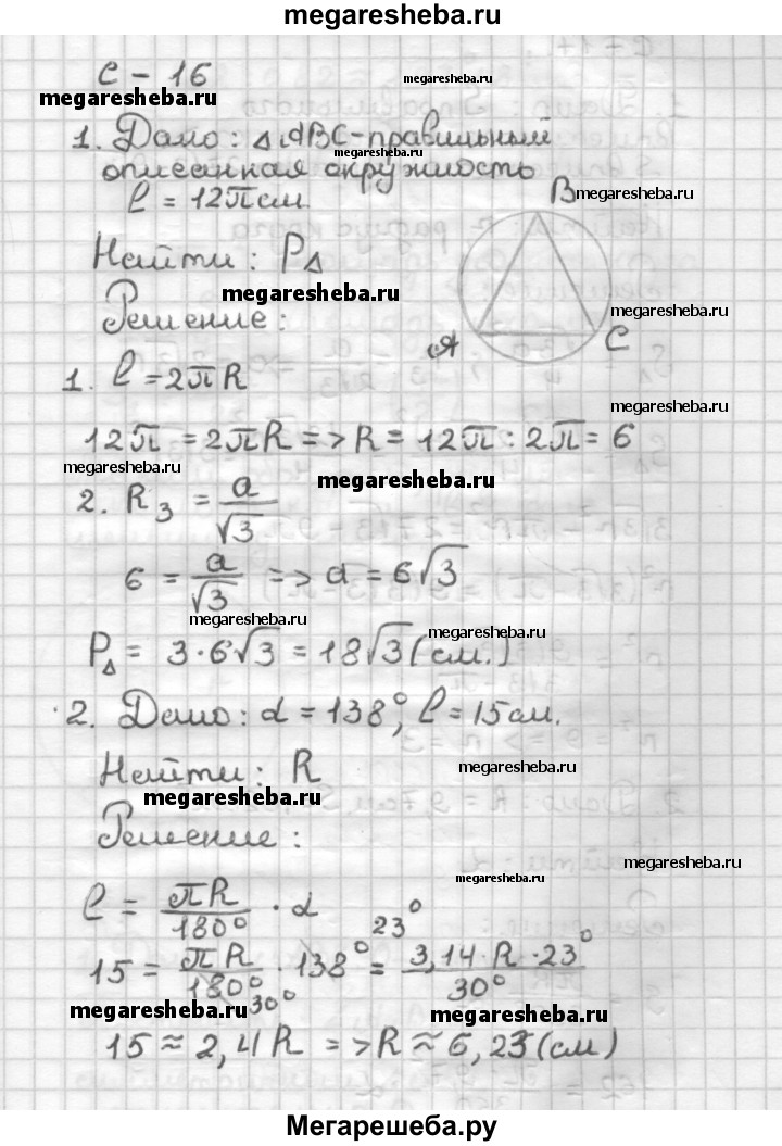 С—16 1. Длина окружности, описанной около правильного треугольника, равна 12л см. Найдите периметр треугольника. 2. С помощью микрокалькулятора найдите радиус дуги окружности, если дуга содержит 138° и ее длина равна 15 см.