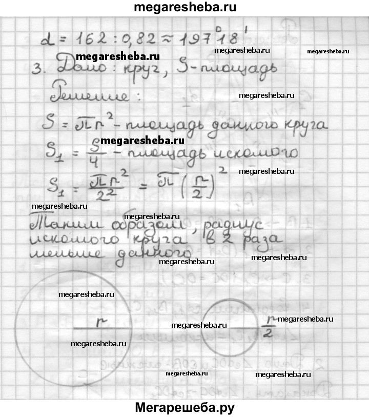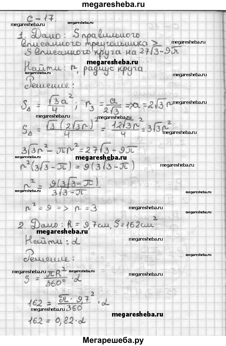 С—17 1. Площадь правильного треугольника больше площади вписанного в него круга на 27√3 - 9л. Найдите радиус круга. 2. Радиус сектора равен 9,7 см, а его площадь — 162 см2. Сколько градусов содержит дуга сектора? Вычислите с помощью микрокалькулятора. 3. Постройте круг, площадь которого в 4 раза меньше площади данного круга.