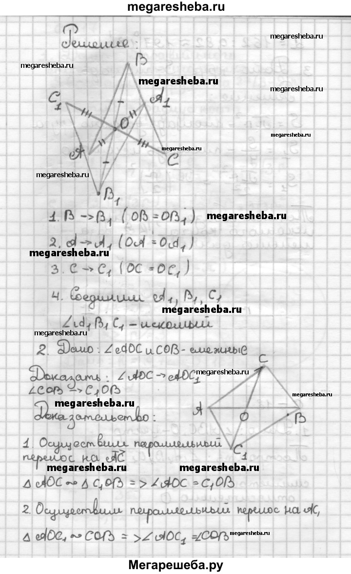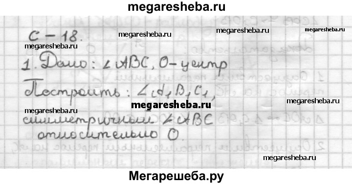 С—18 1. На рисунке 9 изображен угол ABC. Постройте угол, симметричный данному относительно центра О. 2. Докажите, что при движении смежные углы отображаются на смежные.