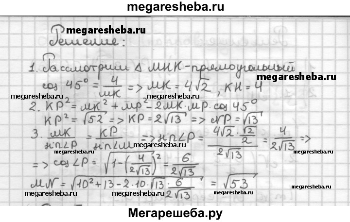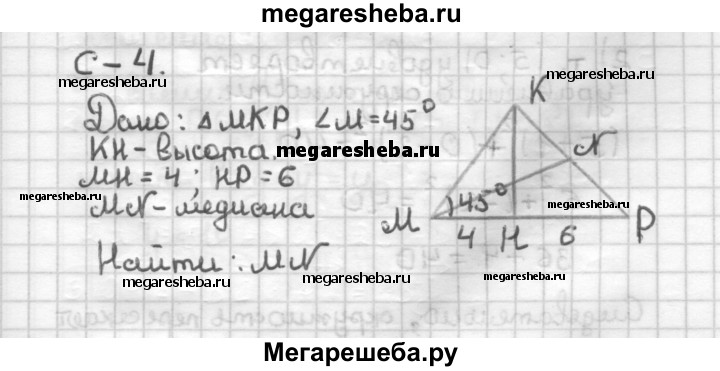 С—4 В треугольнике МКР с углом М, равным 45°, высота КН делит сторону MP на отрезки, длины которых 4 и 6, считая от вершины М. Найдите длину медианы, проведенной из вершины М.