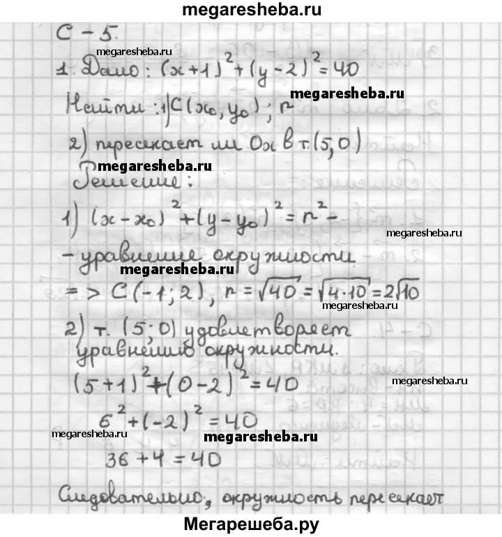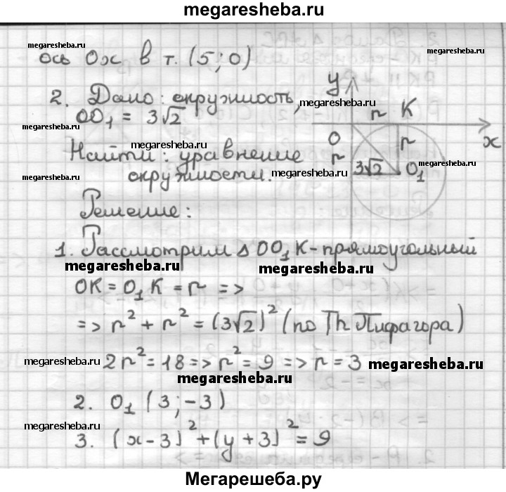 С—5 1. Окружность задана уравнением (х + 1)2 + (у - 2)2 = 40. 1) Найдите координаты центра этой окружности и ее радиус. 2) Пересекает ли эта окружность ось Ох в точке (5; 0)? 2. На рисунке 8 окружность касается осей координат, ОО1 = 3√2. Напишите уравнение этой окружности.