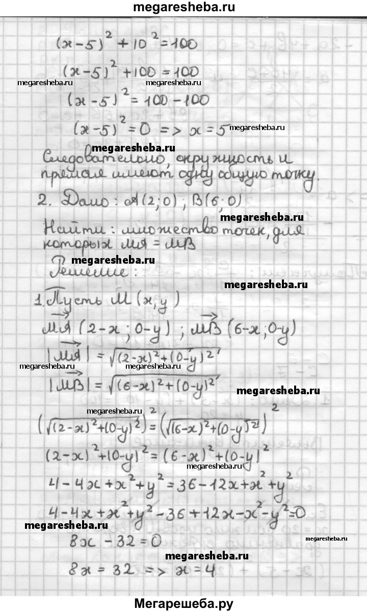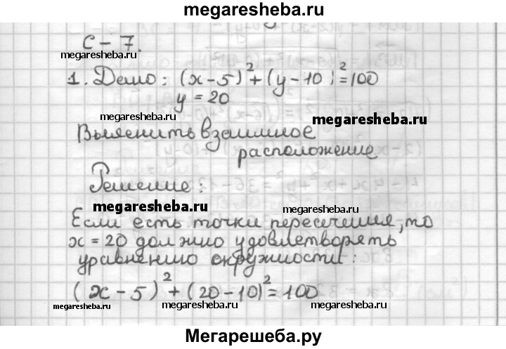 С—7 1. Выясните взаимное расположение прямой у = 20 и окружности (x - 5)2 + (у - 10)2 = 100. 2. Даны две точки А (2; 0) и В (6; 0). Найдите множество всех таких точек М, для которых MA = MB.