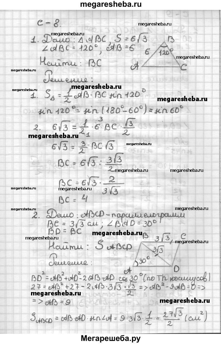 С—8 1. В треугольнике ABC ∠ABC - 120°, АВ = 6. Площадь треугольника равна 6√3. Найдите ВС. 2. В параллелограмме ABCD ВС = 3√3 см, ∠BAD = 30°, BD = ВС. Найдите площадь параллелограмма.