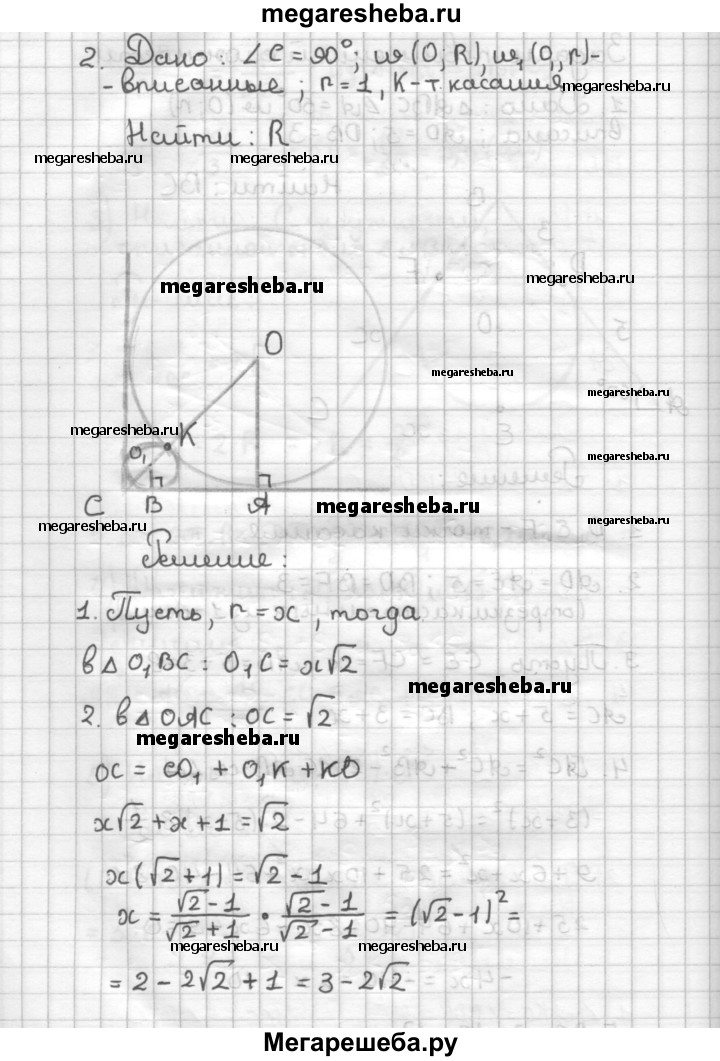 2. В прямой угол вписана окружность единичного радиуса. Вторая окружность также вписана в тот же угол, касается первой окружности и имеет меньший радиус. Найдите радиус второй окружности.