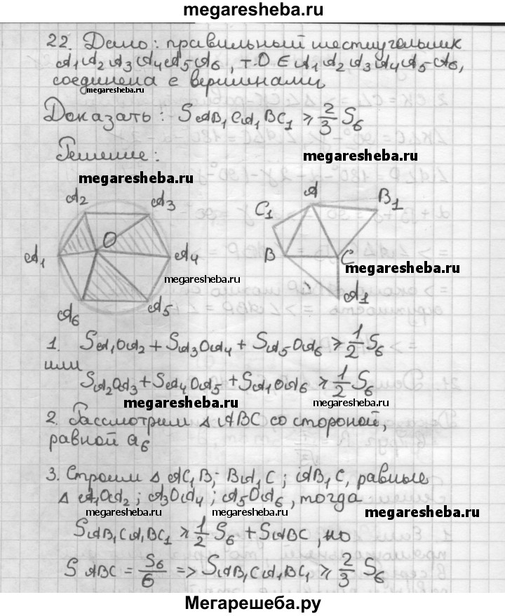 22. Точка, лежащая внутри правильного шестиугольника, соединена с его вершинами. Докажите, что из этих отрезков можно составить шестиугольник, площадь которого не менее площади данного шестиугольника.