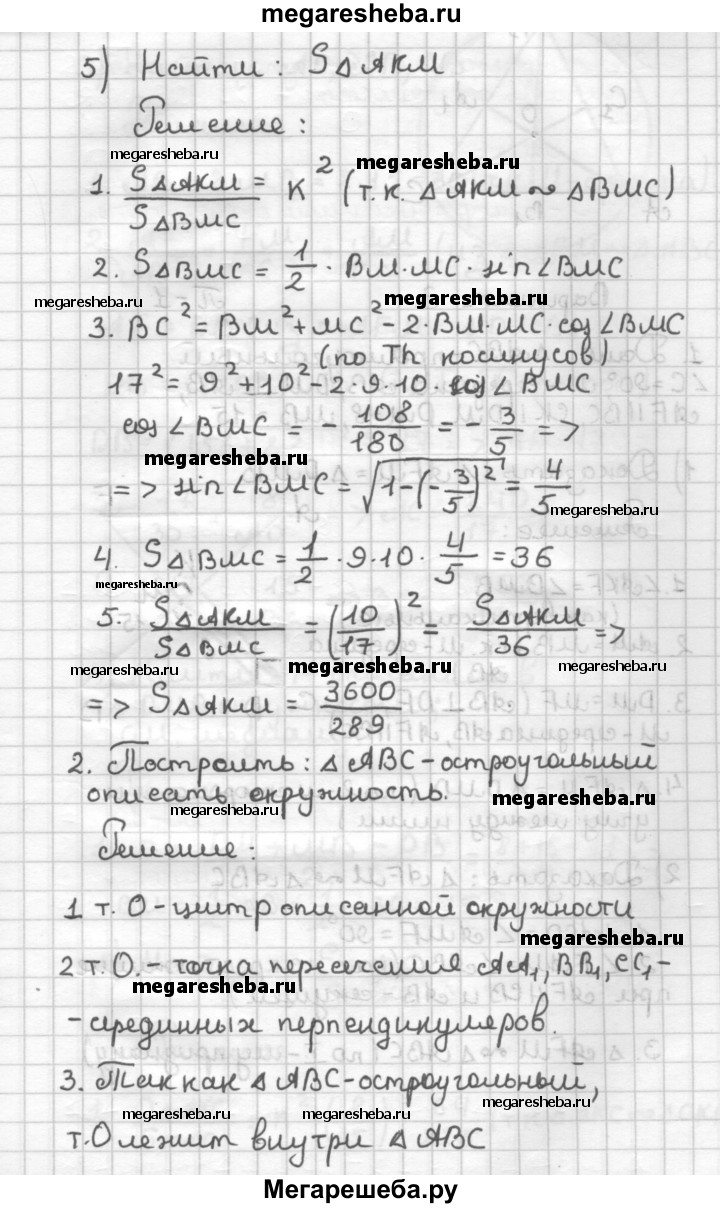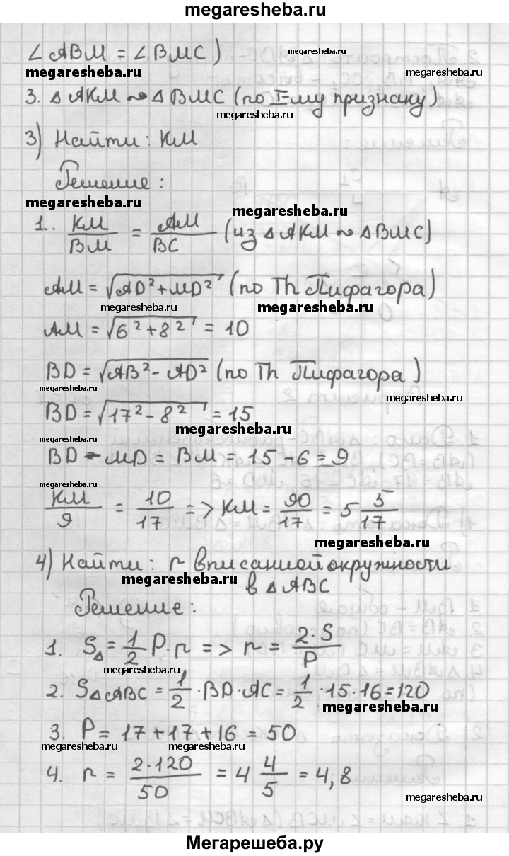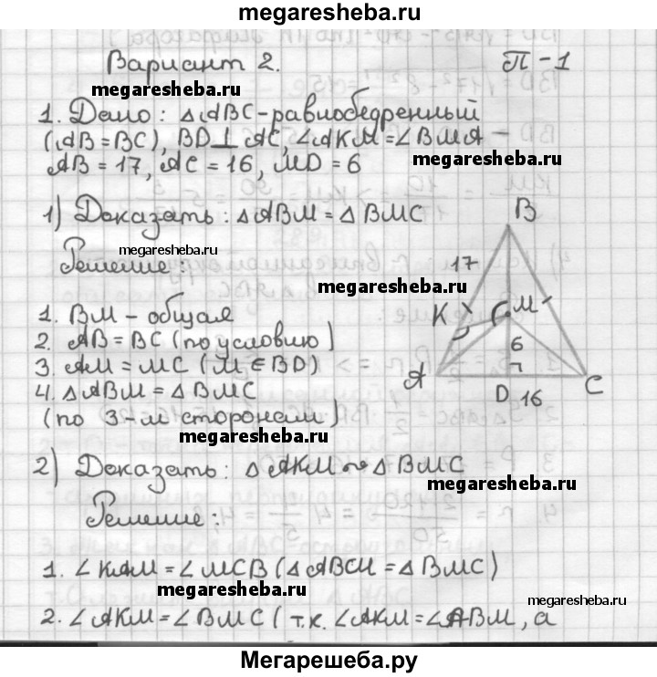 ВАРИАНТ 2 1. На рисунке 51 треугольник ABC равнобедренный (АВ = ВС), BD ⊥ AC, ∠AKM = ZBMA, АВ = 17, АС = 16, MD = 6. 1) Докажите, что ∆АВМ = ∆ВМС. 2) Докажите, что ∆АКМ ∼ ∆ВМС. 3) Найдите КМ. 4) Найдите радиус окружности, вписанной в треугольник ABC. 5) Найдите площадь треугольника АКМ. 2. Начертите остроугольный треугольник и опишите около него окружность.