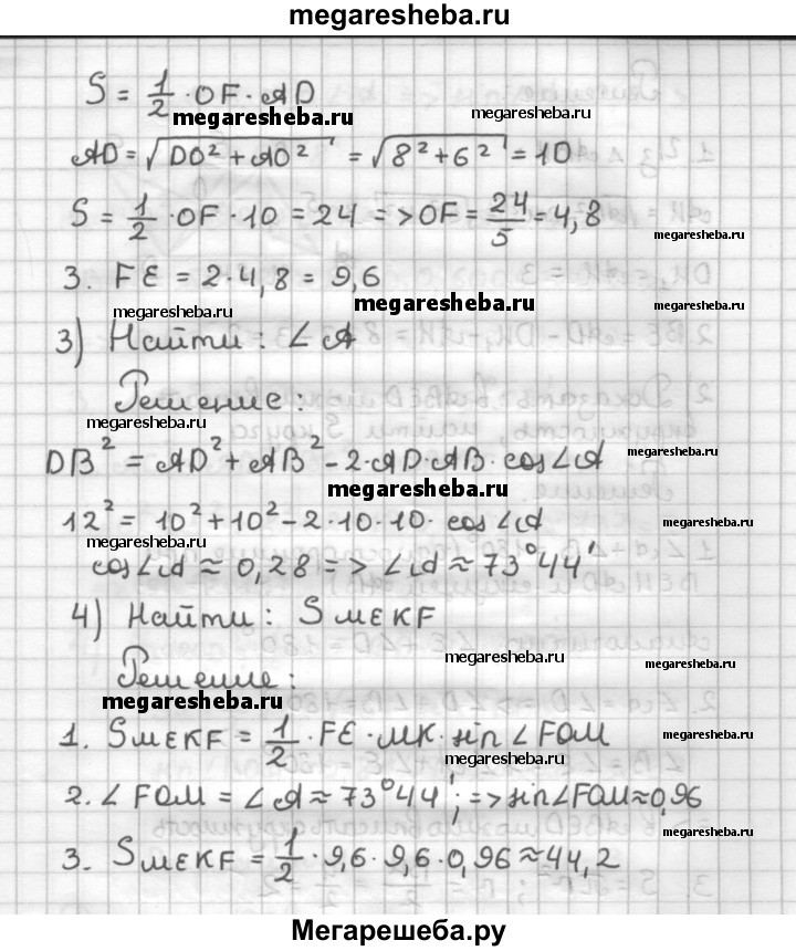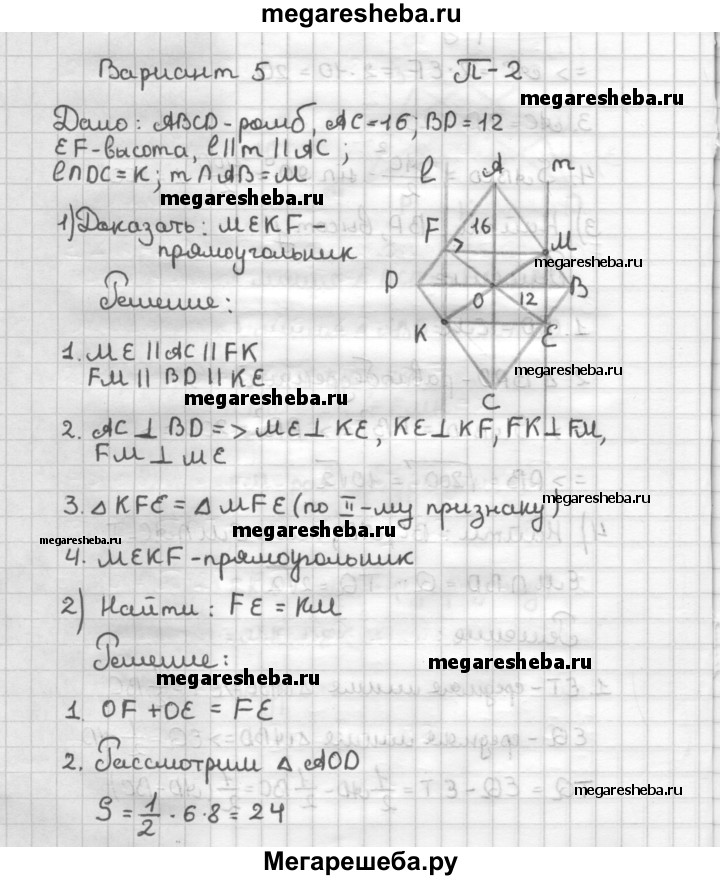ВАРИАНТ 5 П—2 Диагонали ромба ABCD равны 16 и 12. Через точку пересечения диагоналей О проведена высота ромба FE (Е ∈ ВС, F ∈ AD). Через точки Е и F проведены прямые, параллельные АС, до пересечения со сторонами АВ и CD в точках М и К соответственно. 1) Докажите, что MEKF — прямоугольник. 2) Найдите диагонали этого прямоугольника. 3) С помощью микрокалькулятора найдите острый угол ромба. 4) Найдите, площадь прямоугольника.