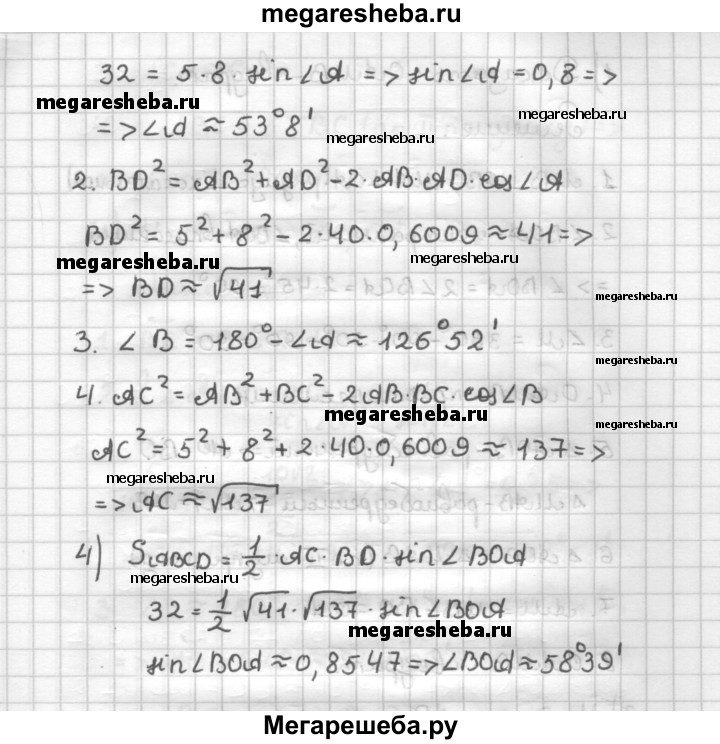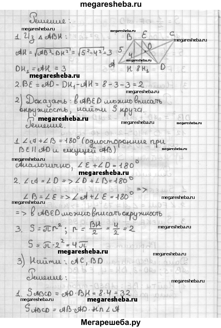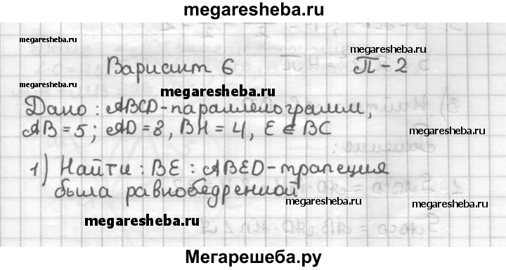 ВАРИАНТ 6 П—2 ABCD — параллелограмм, АВ - 5, AD = 8. Высота параллелограмма равна 4. На стороне ВС выбрана точка Е. 1) Найдите BE так, чтобы трапеция ABED была равнобедренной. 2) Докажите, что в эту трапецию можно вписать окружность, и найдите площадь вписанного в эту трапецию круга. 3) Найдите диагонали параллелограмма. 4) С помощью микрокалькулятора найдите острый угол между его диагоналями.