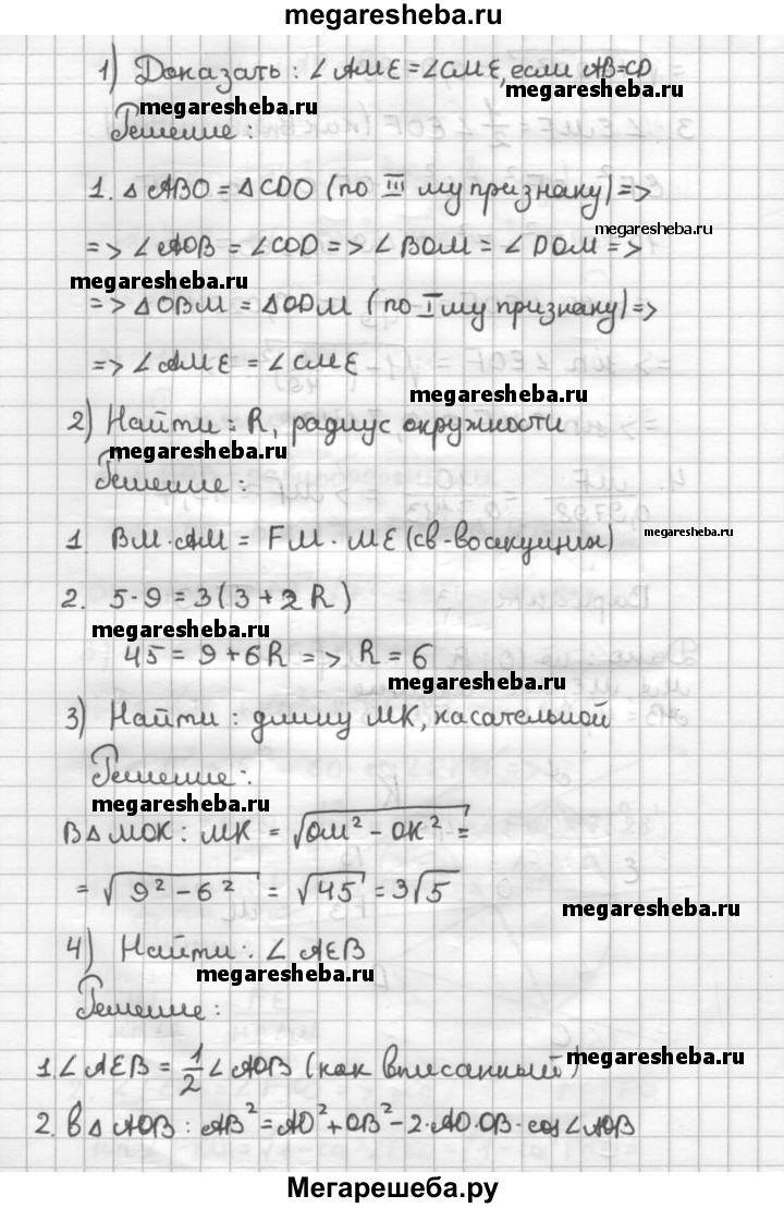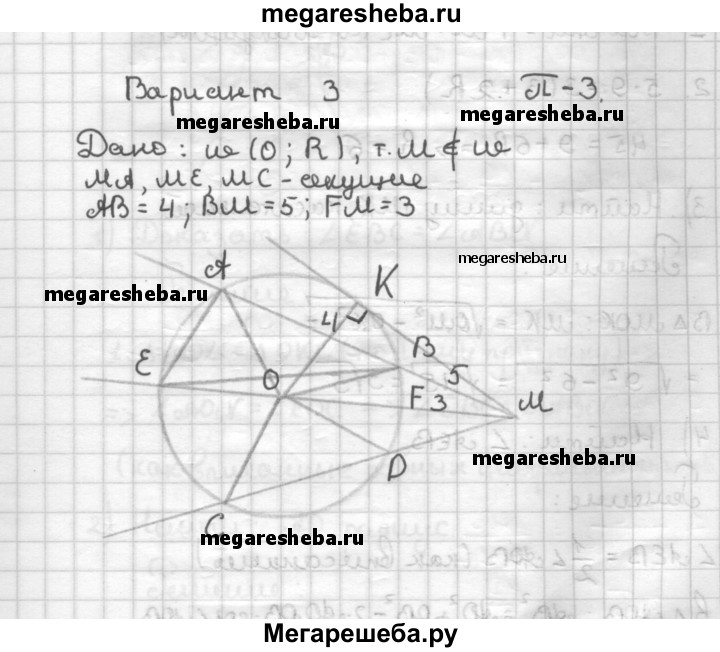 ВАРИАНТ 3 П—3 Точка М находится вне круга с центром О. Из точки М проведены три секущие: первая секущая пересекает окружность в точках В и А (М—В—А), вторая — в точках D и С (М—D—С), а третья — в точках F и Е (М—F—Е) и проходит через центр окружности, АВ = 4, ВМ = 5, FM = 3. 1) Докажите, что если АВ = CD, то ∠AME = ∠CME. 2) Найдите радиус окружности. 3) Найдите длину касательной, проведенной из точки М к окружности. 4) Найдите величину угла АЕВ.
