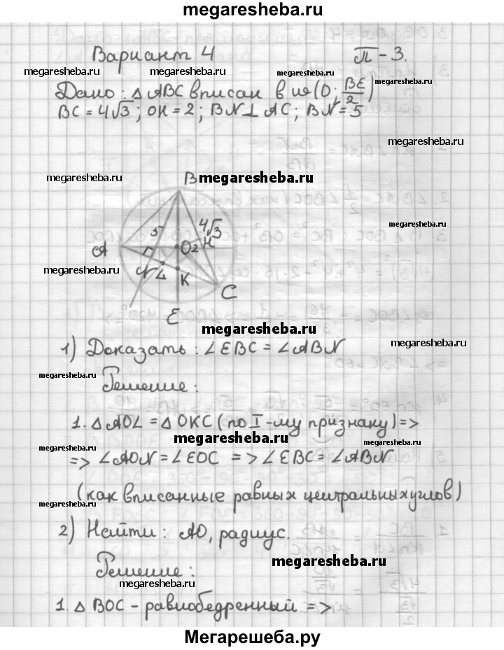 ВАРИАНТ 4 П—3 Остроугольный треугольник ABC вписан в окружность с центром О, BE — диаметр этой окружности, ВС = 4√3. Сторона ВС удалена от центра окружности на расстояние, равное 2, BN 1 AC, BN = 5. 1) Докажите, что ∠EBC = ∠ABN. 2) Найдите радиус окружности. 3) Найдите АВ. 4) Найдите градусную меру дуги АВ.