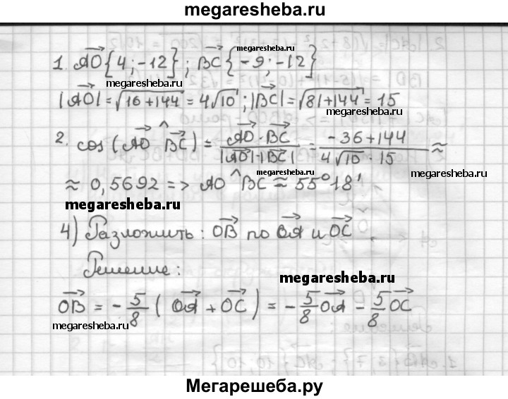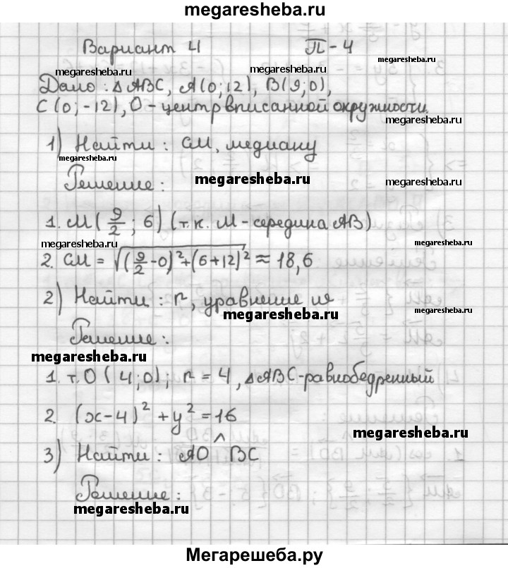 ВАРИАНТ 4 П—4 Треугольник ABC задан координатами своих вершин: А(0; 12), В (9; 0), С(0; -12), О — центр вписанной в треугольник окружности. 1) Найдите длину медианы СМ этого треугольника. 2) Найдите радиус вписанной в этот треугольник окружности и уравнение этой окружности. 3) Найдите угол между прямыми АО и ВС. 4) Разложите вектор ОВ по векторам OA и ОС.