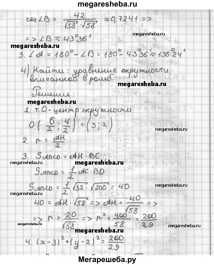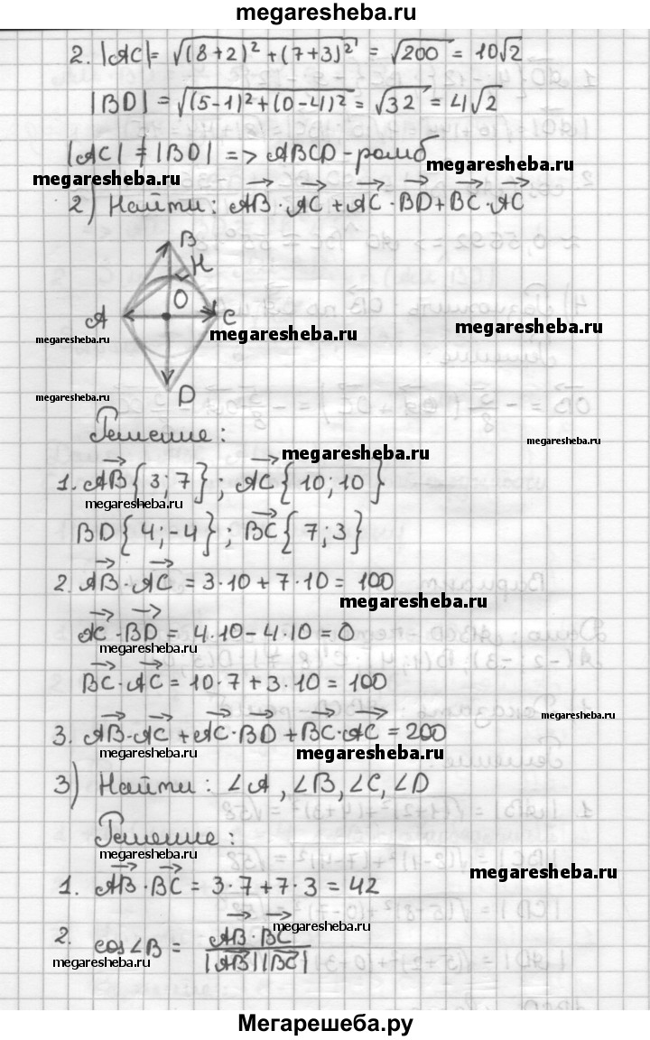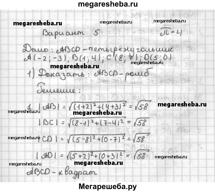 ВАРИАНТ 5 П—4 Четырехугольник ABCD задан координатами своих вершин: А(-2; -3), В(1; 4), С(8; 7), D(5; 0). 1) Докажите, что ABCD — ромб. 2) Вычислите АВ • АС + АС • BD + ВС • АС. 3) Найдите углы ромба. 4) Напишите уравнение окружности, вписанной в ромб.