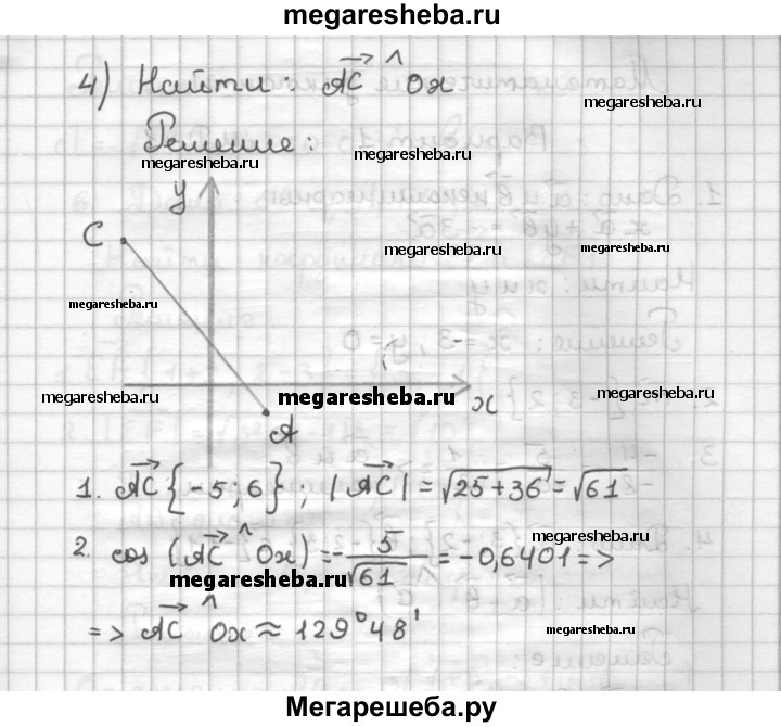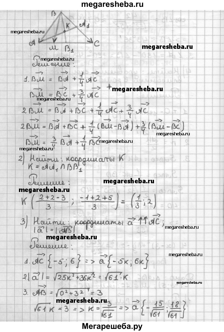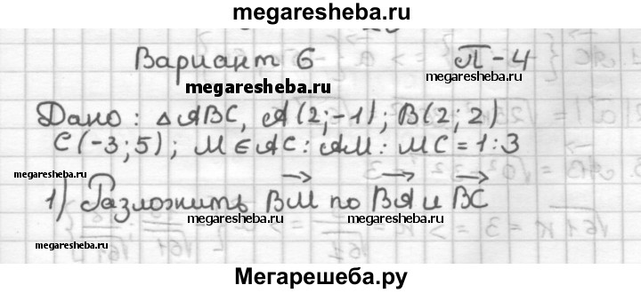 ВАРИАНТ 6 П—4 Треугольник ABC задан координатами своих вершин: А(2; -1), В(2; 2), С(-3; 5), М е АС, причем AM : МС =1:3. 1) Разложите вектор ВМ по векторам В А и ВС. 2) Найдите координаты точки К пересечения медиан этого треугольника. 3) Найдите координаты вектора а, сонаправленного с вектором АС, длина которого равна длине вектора АВ. 4) Найдите угол между вектором АС и осью абсцисс.