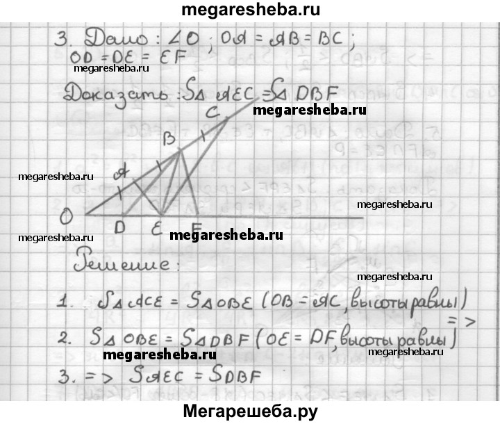 3. На одной стороне угла с вершиной О отложены равные отрезки OA = АВ = ВС, а на другой стороне — равные отрезки OD = DE = EF. Докажите, что треугольники АЕС и DBF равновелики.