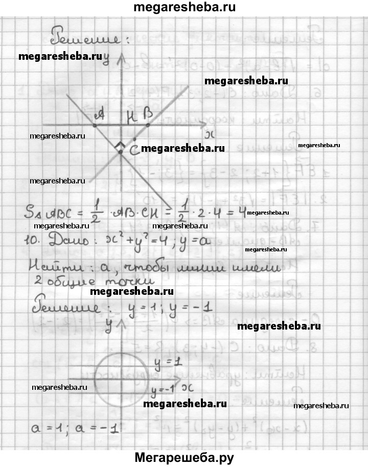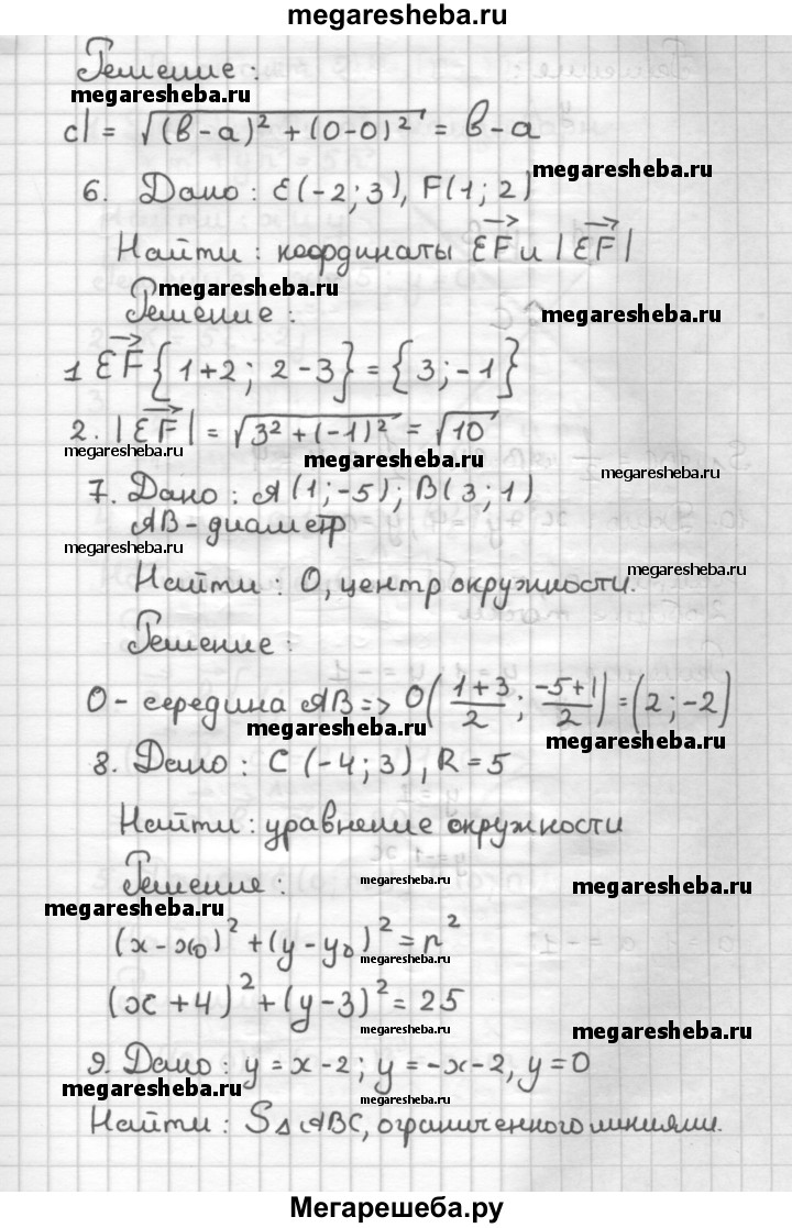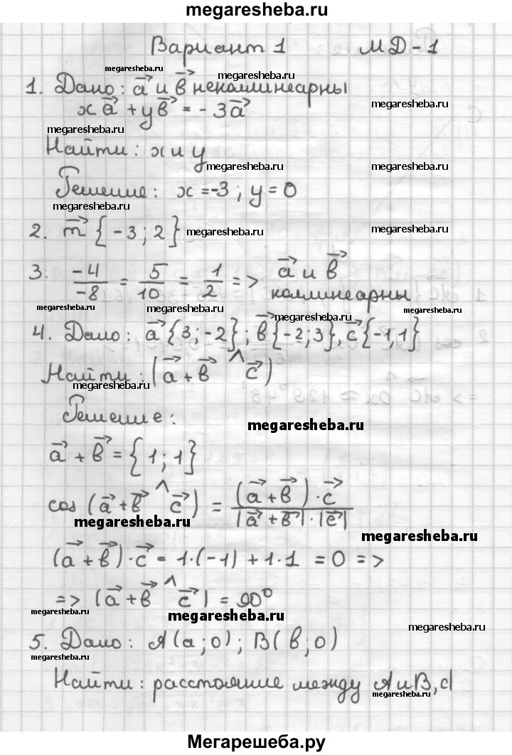МД—1 ВАРИАНТ 1 1. а и b — неколлинеарные векторы, ха +yb =-3а. Найдите X и у. 2. Запишите координаты вектора т = -3i + 2j. 3. Среди векторов а {-4; 5}, b {-8; 10}, с {2; -2,5} укажите пару коллинеарных векторов. 4. а {3; -2}, b {-2; 3}, с {-1; 1}. Чему равен угол между лучами, задающими векторы а + b и с? 5. Найдите расстояние между точками А(а; 0) и В(Ь; 0). 6. Е(-2; 3), .F(l; 2). Найдите координаты вектора EF и его длину. 7. АВ — диаметр окружности, А( 1; -5), В(3; 1). Найдите координаты центра окружности. 8. Напишите уравнение окружности с центром в точке С(-4; 3) и радиусом R = 5. 9. Найдите площадь треугольника, ограниченного линиями у = х - 2, у = -х - 2, у = 0. 10. х2 + у2 = 4, у = а. При каких значениях а эти линии имеют две общие точки?