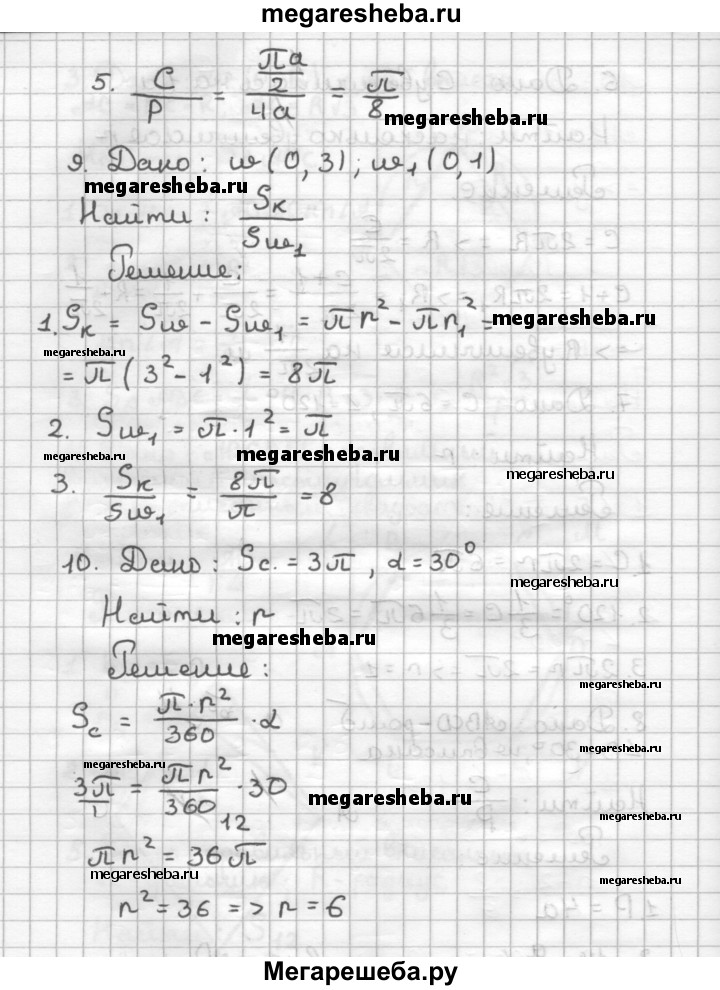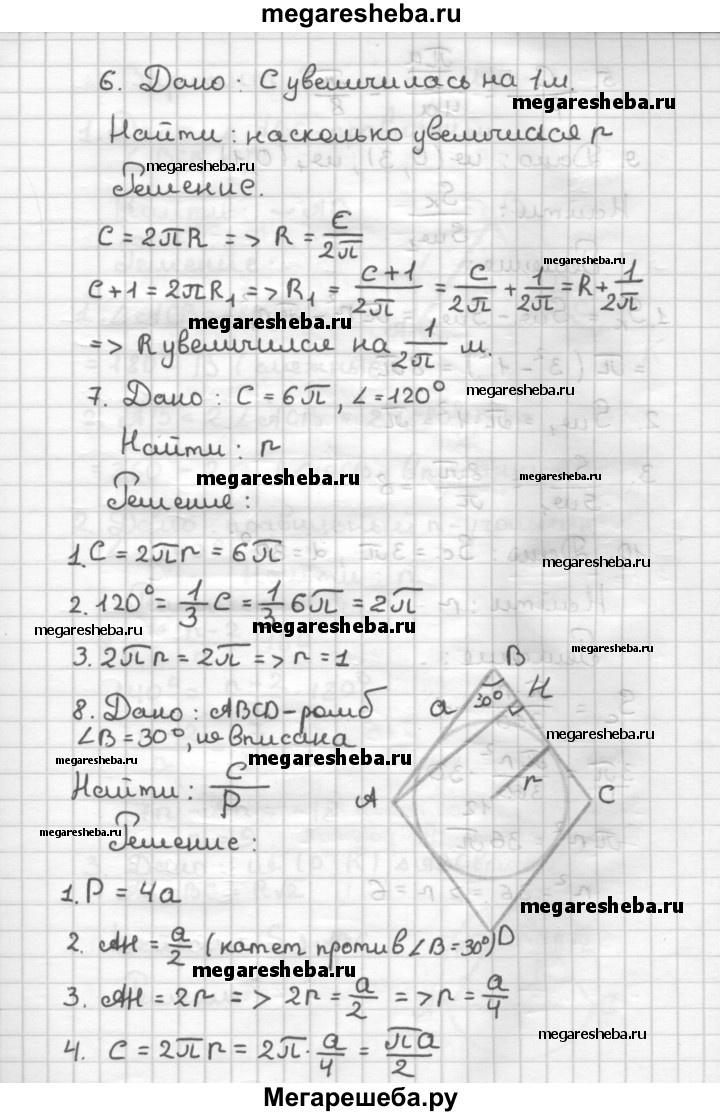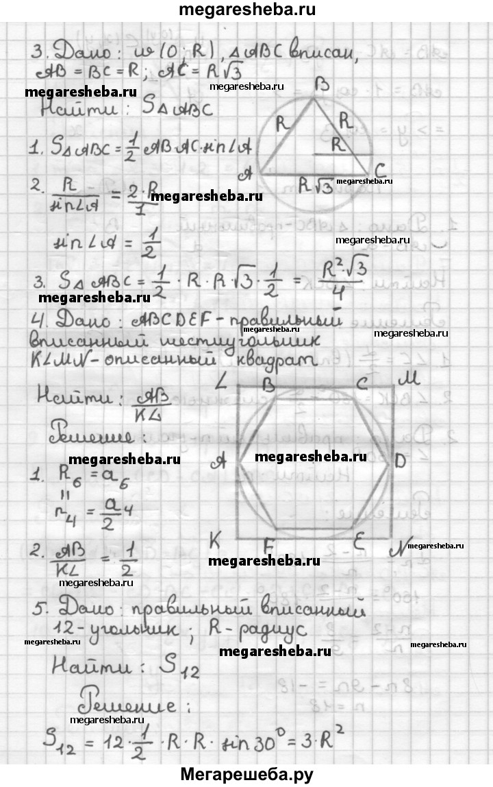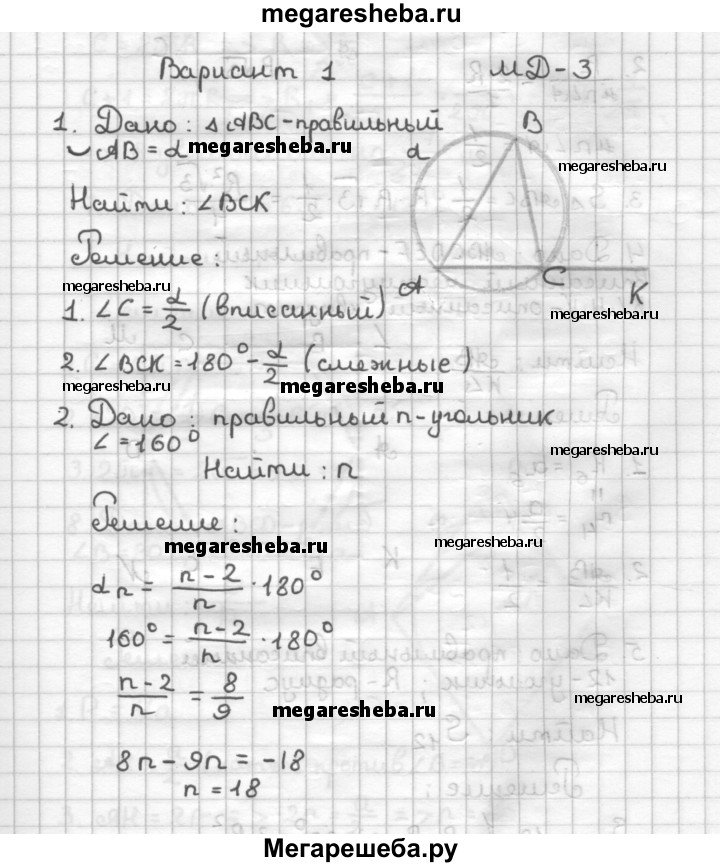 МД—3 ВАРИАНТ 1 1. Сторона правильного n-угольника стягивает дугу, равную а. Чему равен внешний угол этого многоугольника? 2. Угол правильного n-угольника равен 160°. Найдите n. 3. В окружность радиуса R вписан треугольник, две стороны которого равны R и R√З. Найдите площадь треугольника. 4. Найдите отношение сторон правильного вписанного шестиугольника и описанного квадрата около одной и той же окружности. 5. В окружность, радиус которой равен R, вписан правильный 12-угольник. Чему равна его площадь? 6. Длина окружности увеличилась на 1 м. На сколько при этом увеличился радиус окружности? 7. Длина окружности равна 6л. Ее дуга, содержащая 120°, свернута в окружность. Чему равен радиус окружности? 8. Один из углов ромба равен 30°. Найдите отношение длины вписанной в ромб окружности к его периметру. 9. Радиусы двух концентрических окружностей равны 1 и 3. Как относится площадь кольца к площади меньшего круга? 10. Площадь сектора с углом 30° равна 3π. Найдите радиус сектора