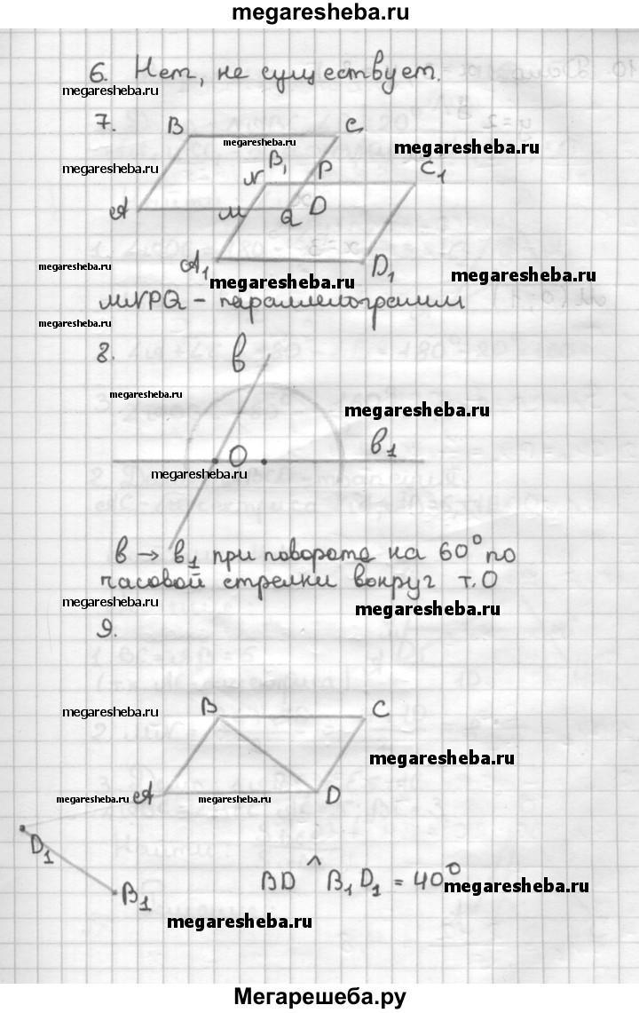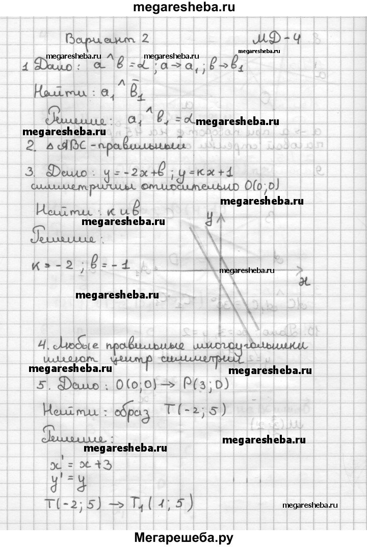 ВАРИАНТ 2 1. Прямые а и b пересекаются под углом а. При некотором движении а —> и b → b1. Чему равен угол между прямыми и &!? 2. Назовите треугольник, который имеет более одной оси симметрии. 3. Прямые у = -2х + b и у - kx + 1 симметричны относительно начала координат. Найдите k и b. 4. Какие правильные многоугольники имеют центр симметрии? 5. Параллельный перенос задан парой точек 0(0; 0) → Р(3; 0). Запишите координаты образа точки Т(-2; 5). 6. Существует ли параллельный перенос, при котором одна сторона треугольника отображается на другую его сторону? 7. При некотором параллельном переносе параллелограмм ABCD отображается на параллелограмм A1B1C1D1. Общая часть этих параллелограммов есть некоторый четырехугольник. Определите его вид. 8. Начертите прямую b и отметьте точку О вне ее. Постройте образ прямой b при повороте вокруг точки О на 60° по часовой стрелке. 9. Параллелограмм ABCD при повороте на 160° по часовой стрелке вокруг центра А отображается на параллелограмм AB1C1D1, BD → B1D1. Чему равен острый угол между прямыми BD и B1D1? 10. Даны две прямые х = 3 и у = 2. Укажите координаты точки на оси Оу, при повороте вокруг которой одна прямая отображается на другую.