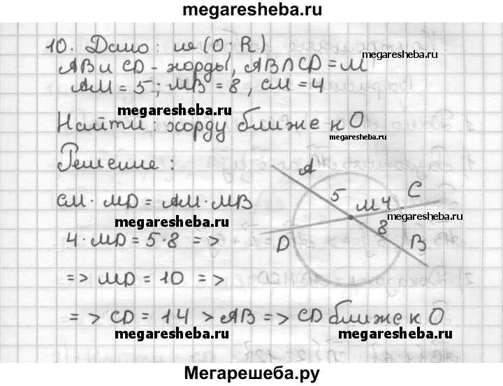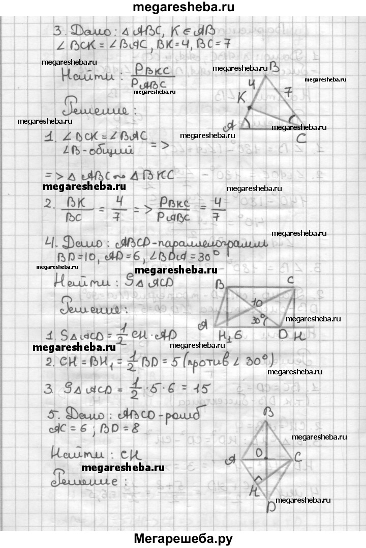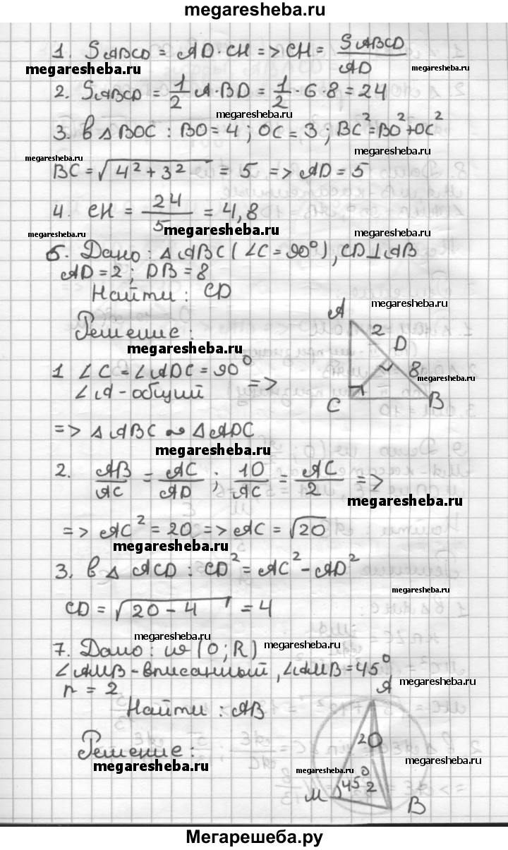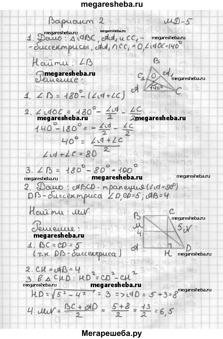 ВАРИАНТ 2 1. В треугольнике ABC биссектрисы АА1 и СС, пересекаются в точке О, ZAOC = 140°. Найдите угол В. 2. В прямоугольной трапеции ABCD (∠A = 90°, AD и ВС — основания) DB — биссектриса угла D, CD = 5, АВ = 4. Найдите среднюю линию трапеции. 3. В треугольнике ABC точка К принадлежит стороне АВ, ∠BCK = ∠BAC, ВК = 4, ВС = 7. Найдите отношение периметров треугольников ВКС и ABC. 4. В параллелограмме ABCD BD = 10, AD = б, ∠BDA = = 30°. Найдите площадь треугольника ACD. 5. Диагонали ромба равны 6 и 8. Найдите его высоту. 6. В прямоугольном треугольнике ABC (∠C = 90°), CD ⊥ АВ, AD = 2, DB = 8. Найдите CD. 7. Угол АМВ вписан в окружность с центром О, ∠AMB = = 45°. Радиус окружности равен 2. Найдите длину хорды АВ. 8. Из точки М, расположенной вне окружности, проведены касательные МА и MB (А и В — точки касания). ∠AMB = 90°, АВ = 10. Найдите расстояние от точки М до центра окружности О. 9. Из точки М проведена касательная МА к окружности (А — точка касания), АС — диаметр окружности, МС пересекает окружность в точке Е, МА = 5. Радиус окружности равен 6. Найдите АЕ. 10. Хорды АВ и CD пересекаются в точке М, AM = 5, MB = 8, CM = 4. Какая из хорд расположена дальше от центра?