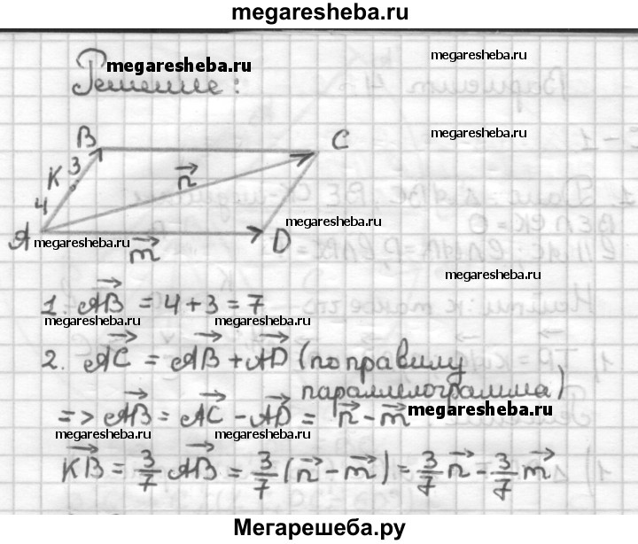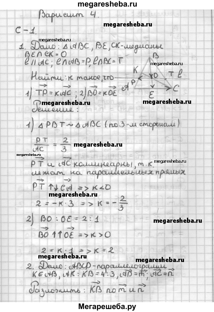 С—1 1. В треугольнике ABC медианы BE и СК пересекаются в точке О. Через точку О проведена прямая, параллельная АС и пересекающая стороны АВ и ВС в точках Р и Т. Найдите, если возможно, такое число k, что: 1) TP = kAC; 2) ВО = kOE. 2. В параллелограмме ABCD К е АВ, причем АК : KB = -4:3. Разложите вектор KB по векторам AD = m и АС - n.