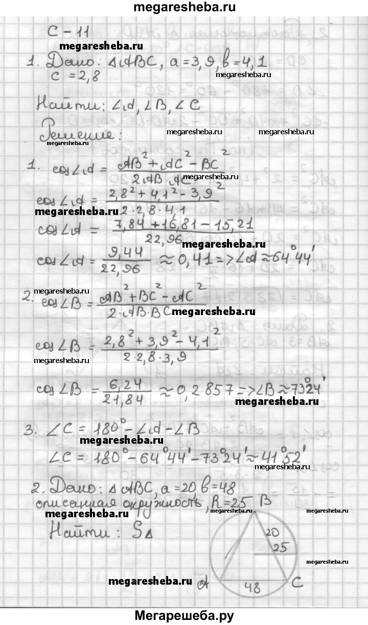 С—11 1. В треугольнике ABC а = 3,9, 6 = 4,1, с = 2,8. Найдите неизвестные элементы треугольника. 2. В треугольнике ABC а = 20, b = 48. Радиус описанной около треугольника окружности равен 25. Найдите площадь треугольника.