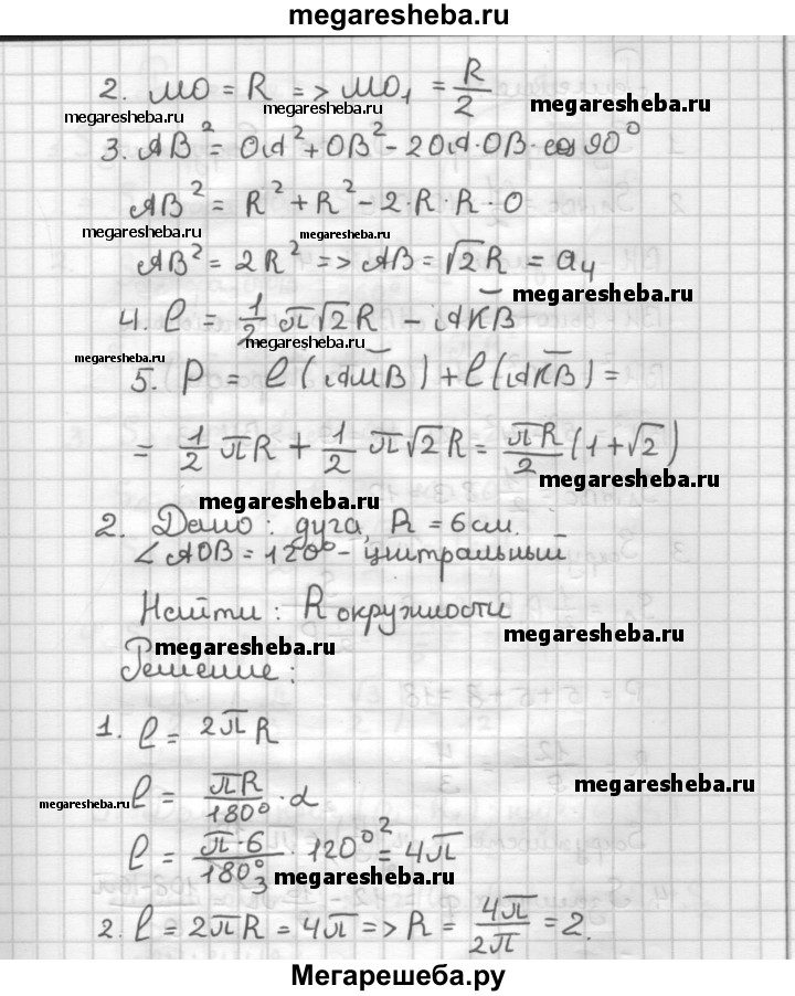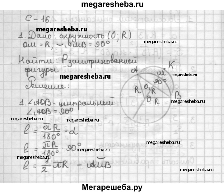 С—16 1. Найдите периметр заштрихованной фигуры, изображенной на рисунке 21, если радиус окружности с центром О равен R, ∠АМВ = 90°. 2. Дуга, радиус окружности которой равен 6 см и центральный угол 120°, свернута в окружность. Найдите радиус окружности. Рис. 21