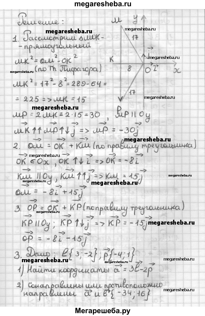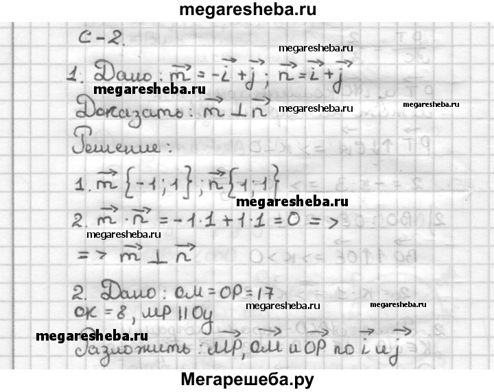 С—2 1. Докажите, что лучи, задающие векторы m = i + j и n = i +j, взаимно перпендикулярны. 2. На рисунке 18 ОМ = ОР= 17, ОК = 8 (MP ⊥ Оу). Разложите векторы MP, ОМ и ОР по координатным векторам i и j. 3. Даны два вектора I {3; -2} и р{- 4; 1}. 1) Найдите координаты вектоpa а = 3j - 2р. 2) Сонаправлены или противоположно направлены векторы а и b {-34; 16}?