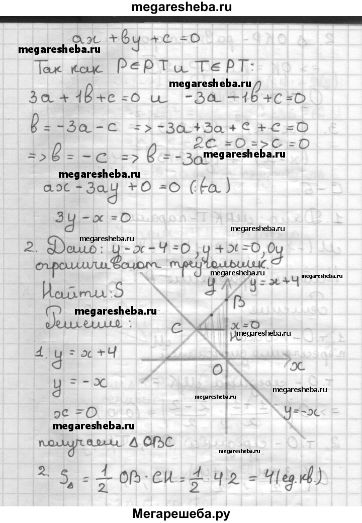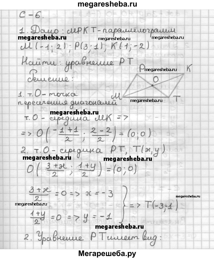 С—6 1. Даны три последовательных вершины параллелограмма МРКТ: М(-1; 2), Р(3; 1) и -2). Напишите уравнение прямой РТ. 2. Найдите площадь треугольника, ограниченного прямыми у — х — 4 = 0, у + х = 0 и осью ординат.