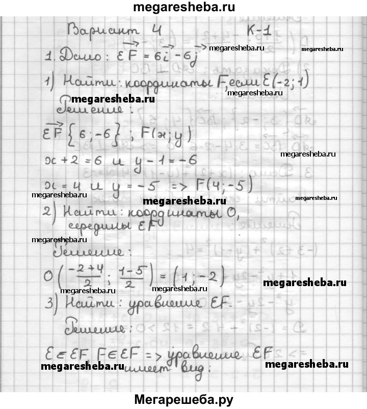 К—1 Вариант 4 1. EF = 6i-6]. 1) Найдите координаты точки F, если Е (-2; 1). 2) Найдите координаты середины отрезка EF. 3) Напишите уравнение прямой EF. 2. Даны точки С(т; 3), D(4; 1), F(2; 4). Известно, что CD = DF. Найдите т. 3. Радиус окружности равен 4. Центр окружности принадлежит оси Оу и имеет отрицательную ординату. Окружность проходит через точку (0; -2). Напишите уравнение окружности. 4*. Вектор т противоположно направлен вектору b {-2; 4} и имеет длину вектора а {2; 2}. Найдите координаты вектора m.